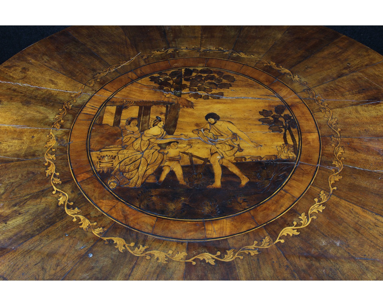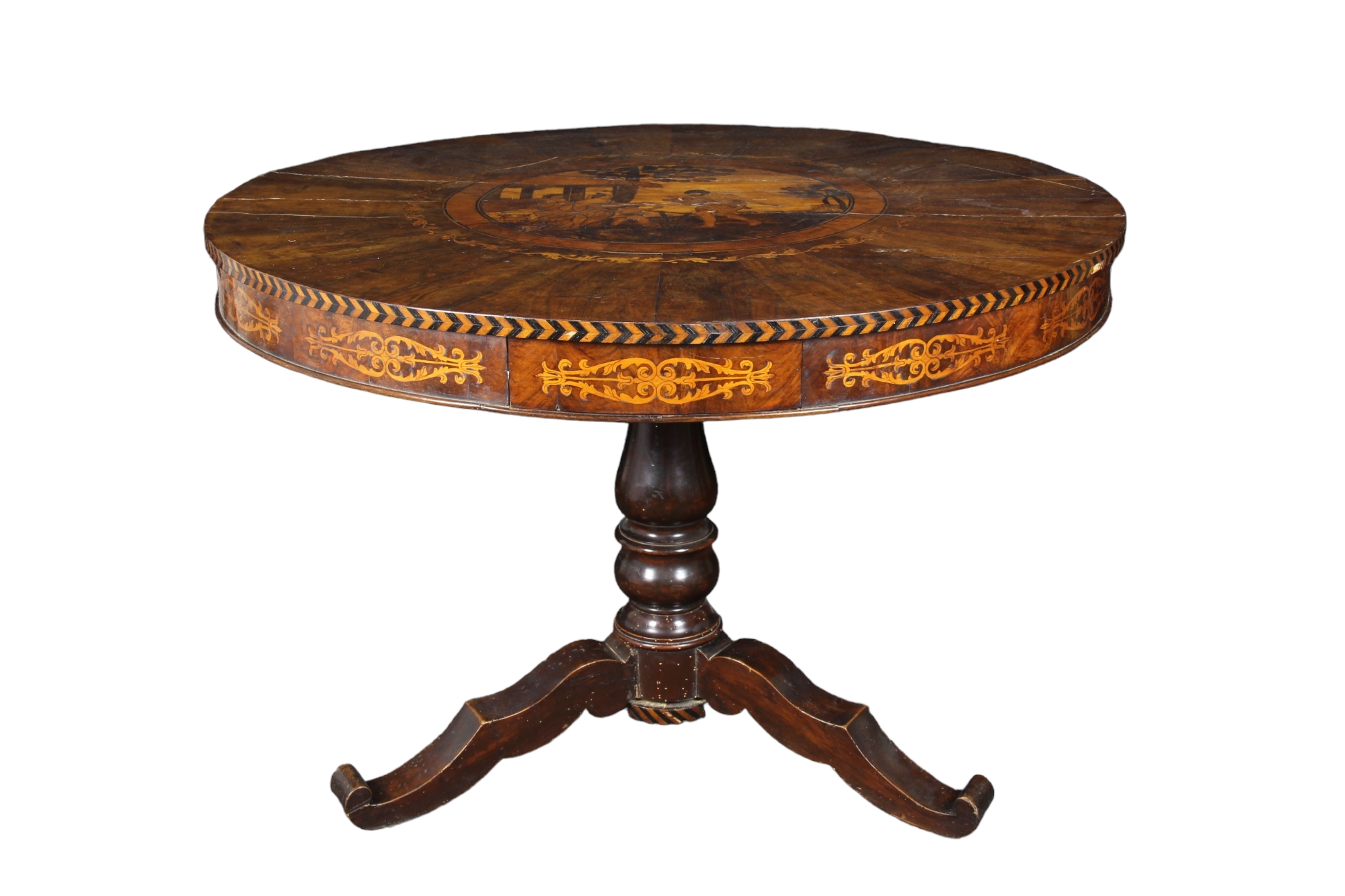 ELEGANTE TAVOLO lastronato in noce e riccamente intarsiato in legni vari , piano raffigurante scena popolare dentro riserva con piede centrale. Lombardia primi 800' . h cm 80 x 114