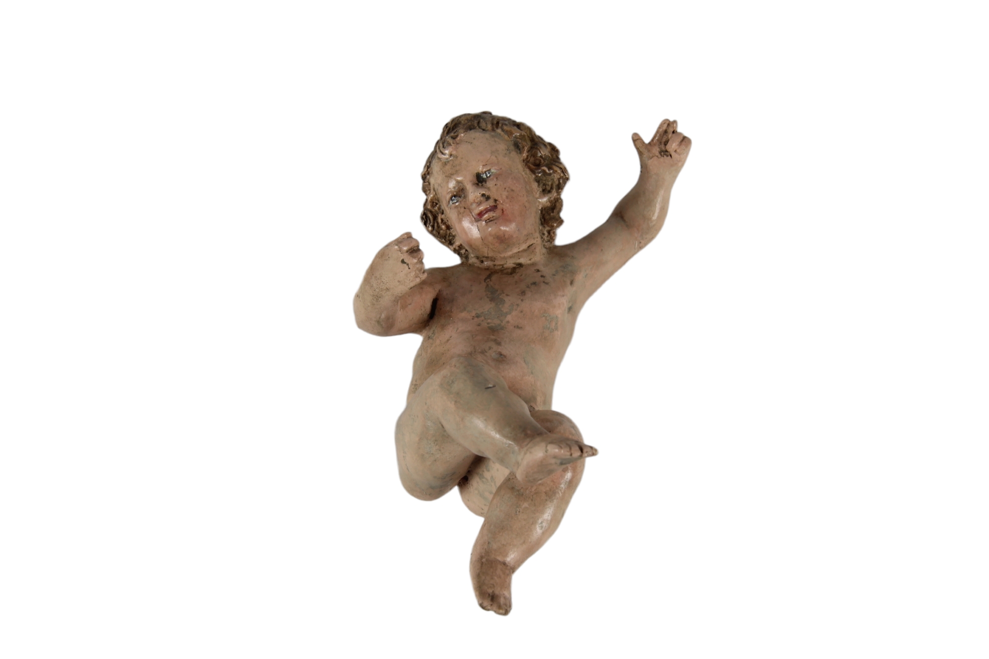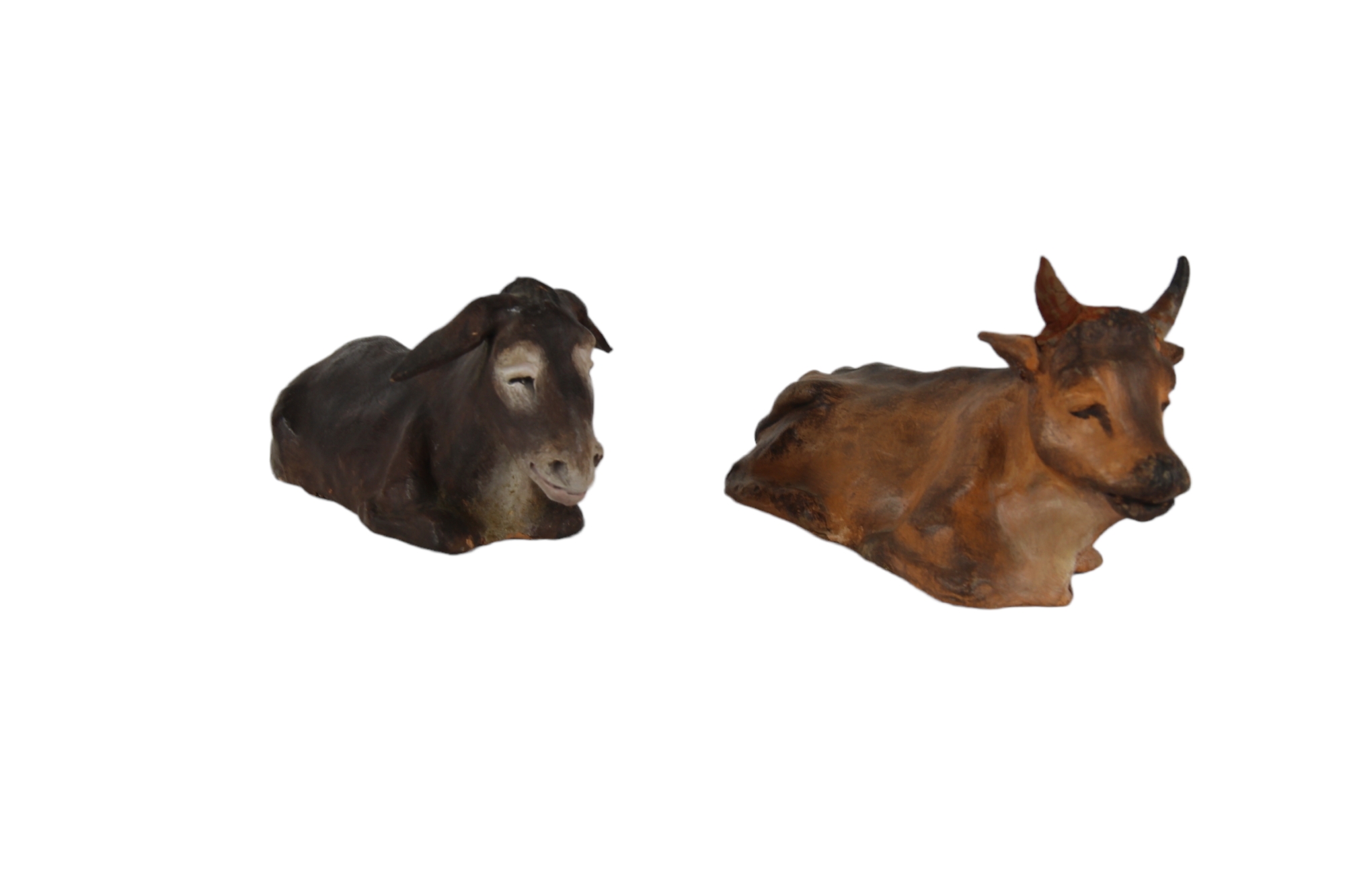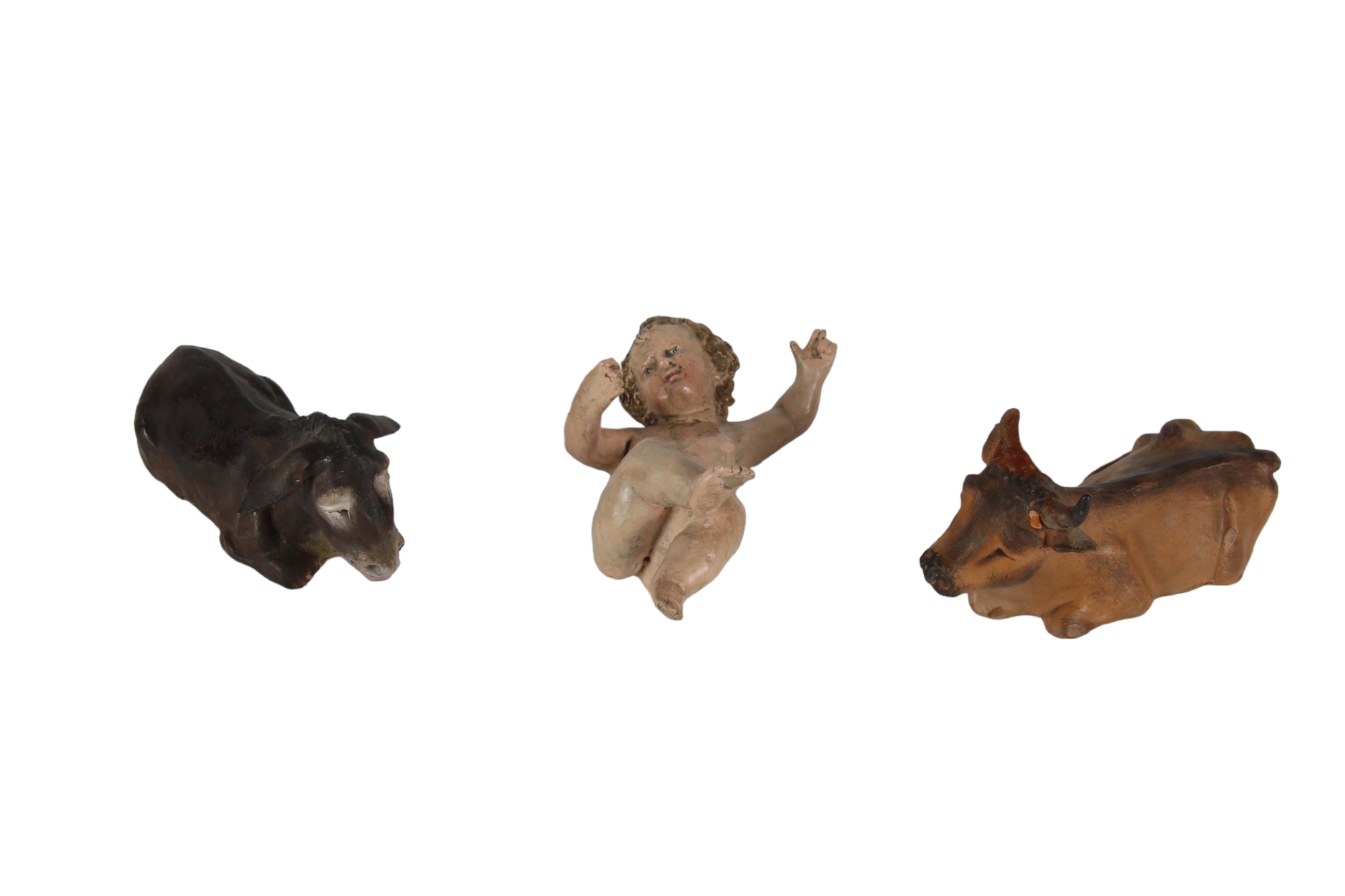BAMBINELLO, BUE ED ASINELLO in terracotta dipinta manifattura napoletana, primo XX secolo.h cm 16 X 9 /h cm 9 X 14 X 6 /h cm 8 X 14 X 6