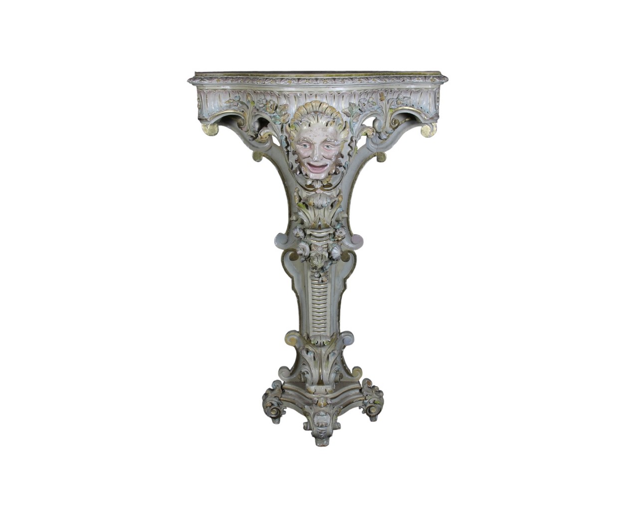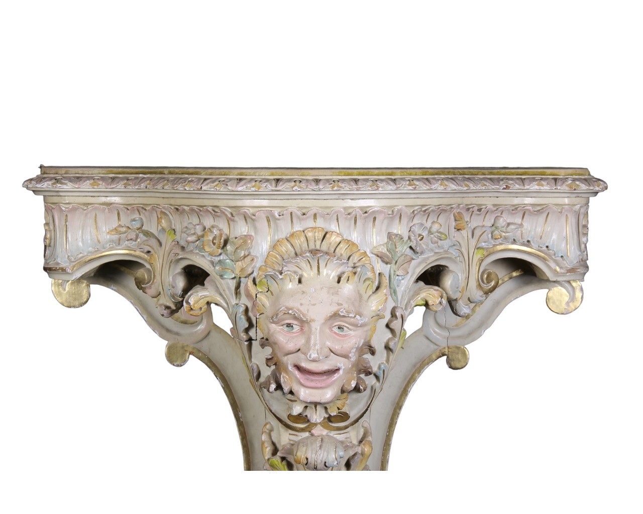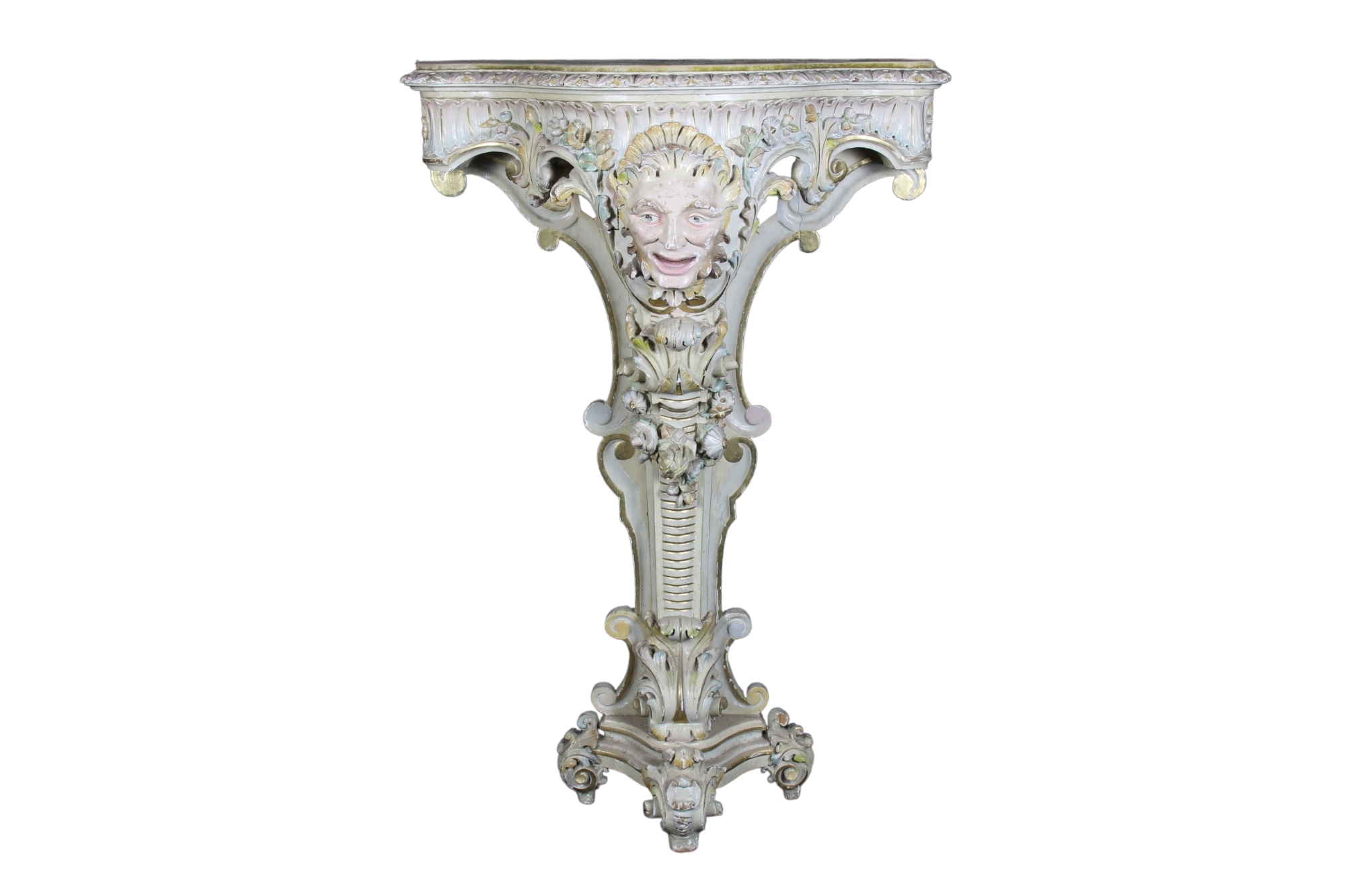 CURIOSA CONSOLLE A VIRGOLA in legno finemente scolpito, laccato e dipinto fronte raffigurante satiro, piano in legno rivestito in velluto. Venezia primi XIX secolo. h cm 126,5 x 84,5 x 35