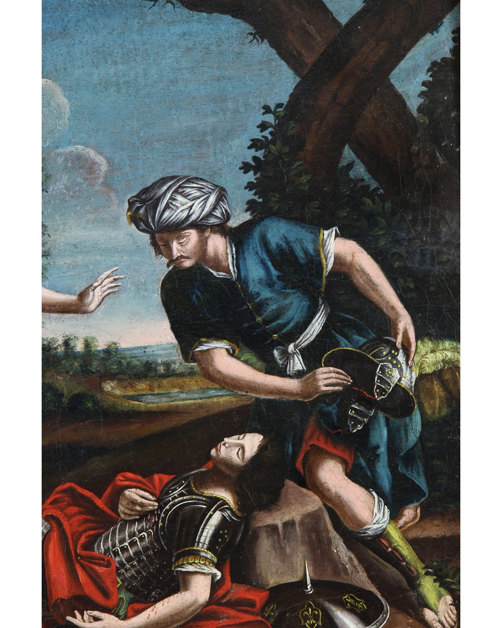 DIPINTO OLIO SU TELA Raffigurante Armida trova Rinaldo in un paesaggio bucolico , cornice in legno dorata. Scuola italiana XVIII secolo .h cm 58 x 64