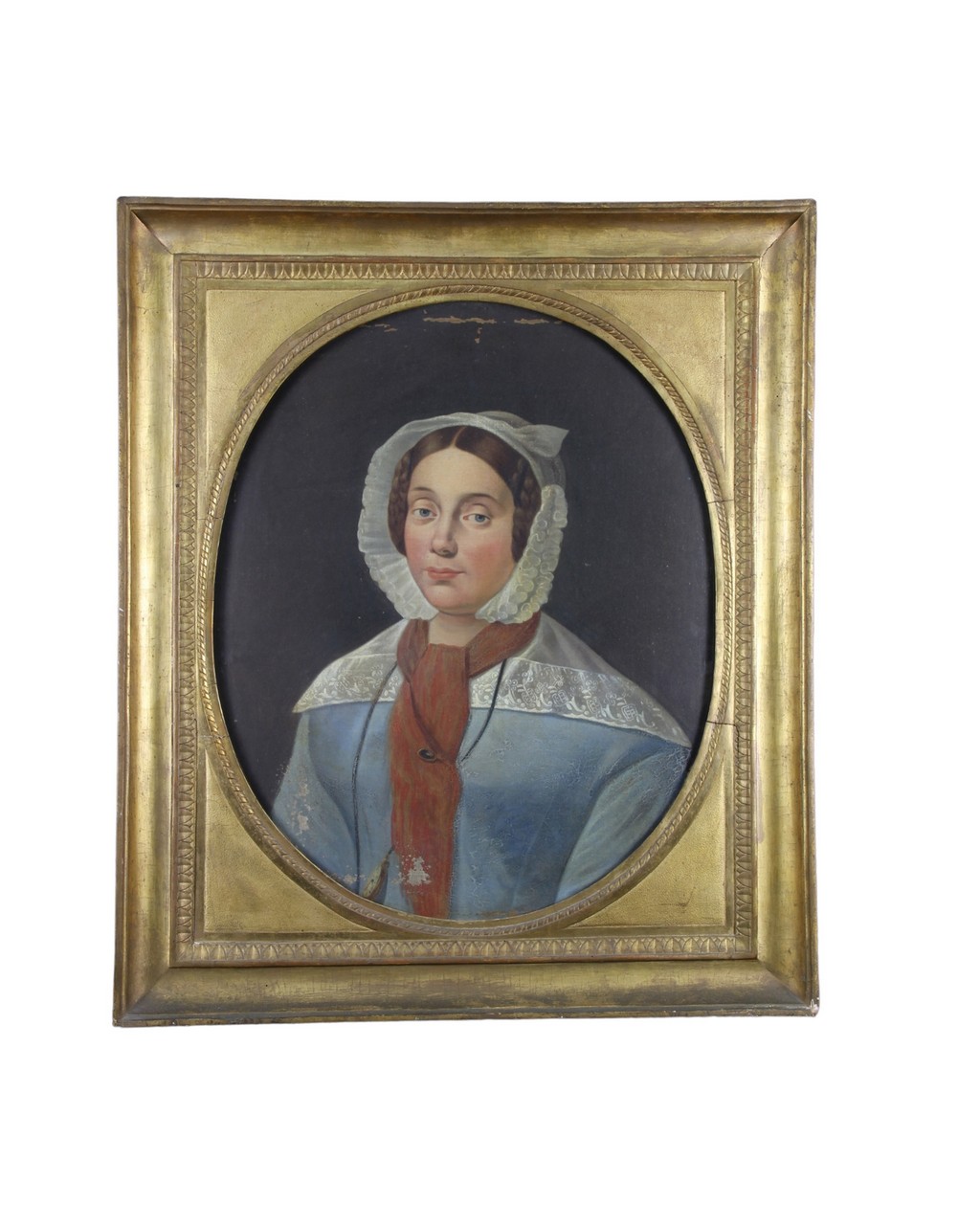 OLIO SU TELA Raffigurante Figura femminile , dentro elegante cornice a canna ciaccata in legno dorato. Sicilia 1820 circa. h cm 71 x 58/h cm 93 x 79
