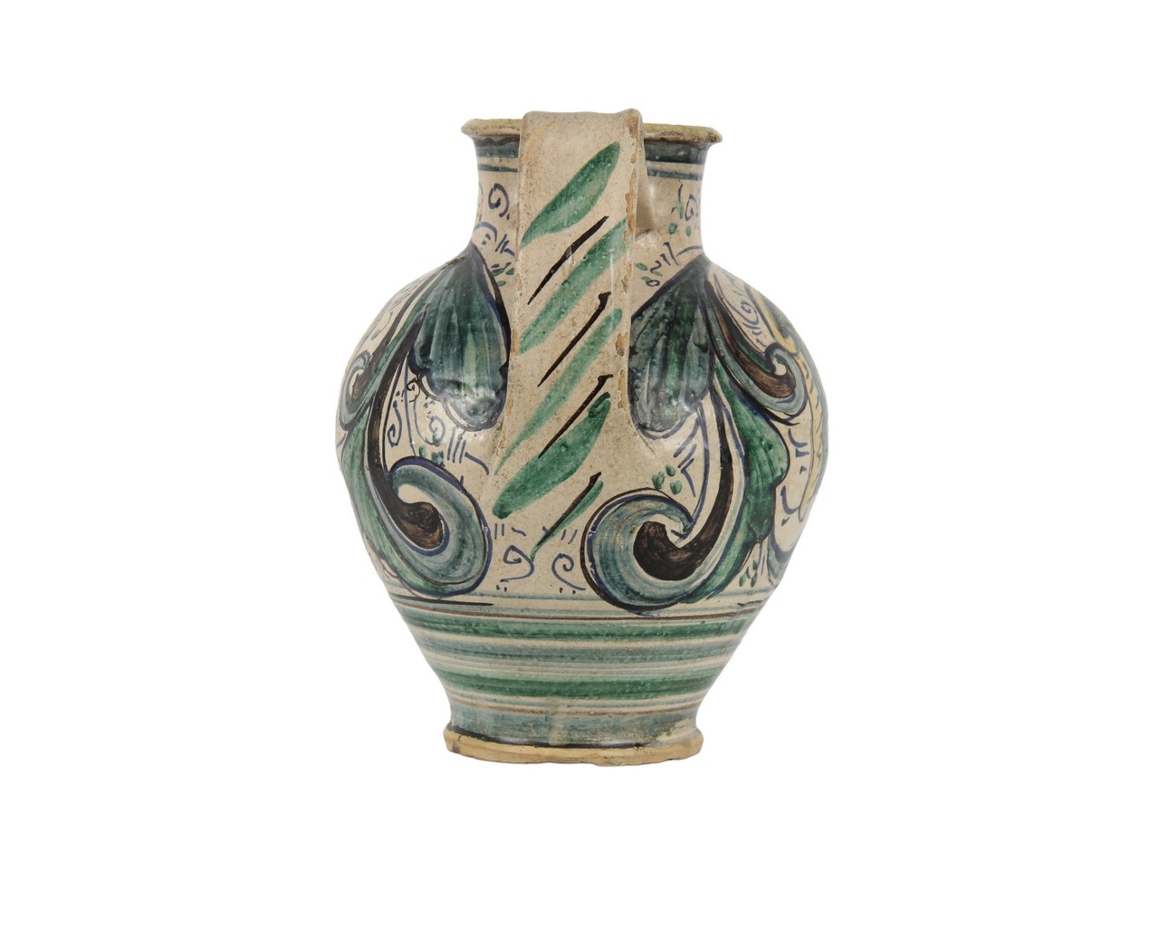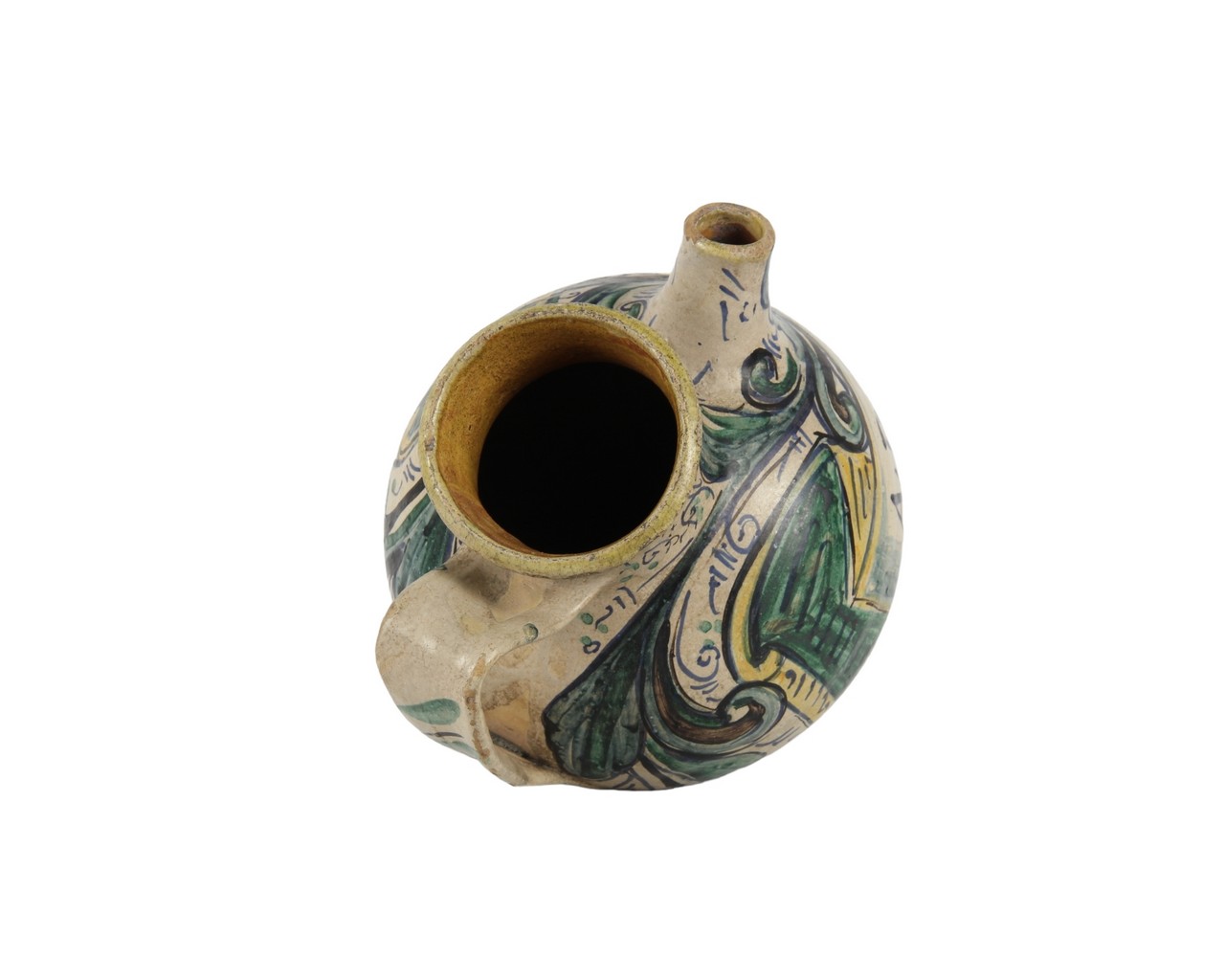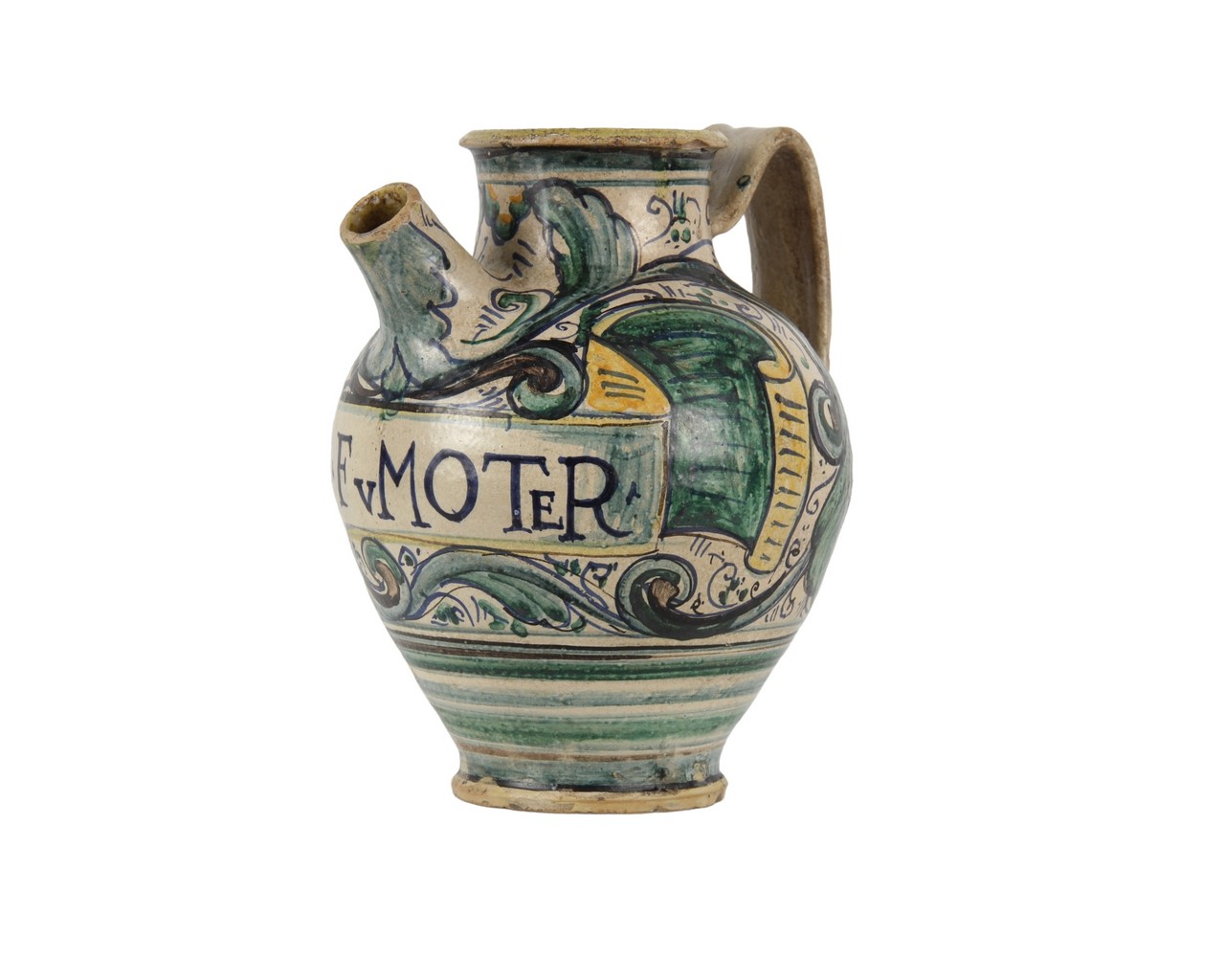 BROCCA DA FARMACIA in maiolica policroma decorata a motivi floreali, reca scritta dentro riserva. Montelupo XVI/XVII secolo . h cm 26 X 24