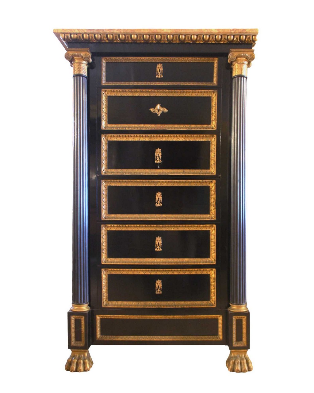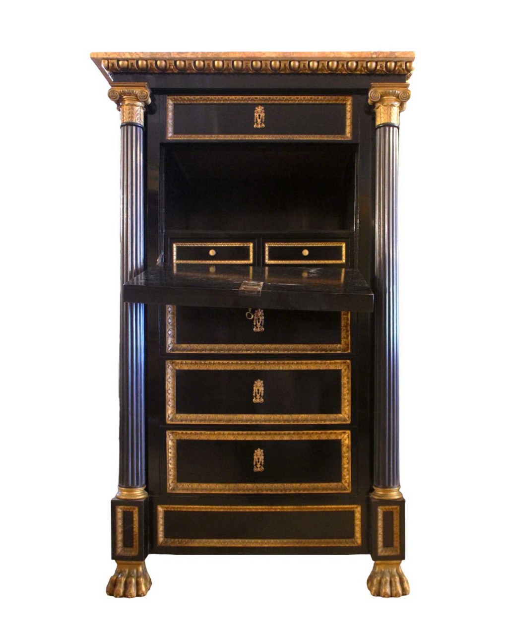SECRETAIRE IMPERO in mogano con dorature, decorato da colonne con capitello di ordine ionico. XIX secolo Sicilia. h cm 146 x 85 x 55,5