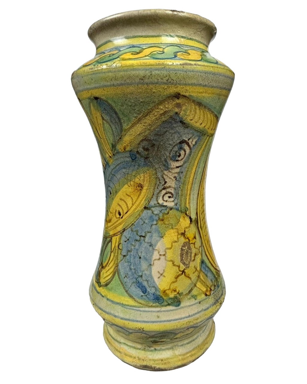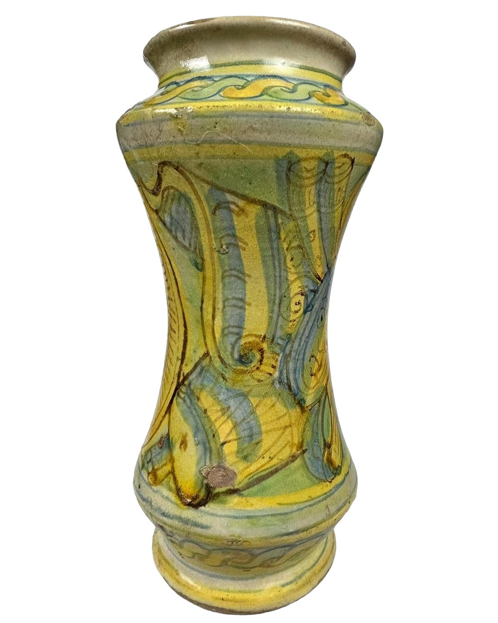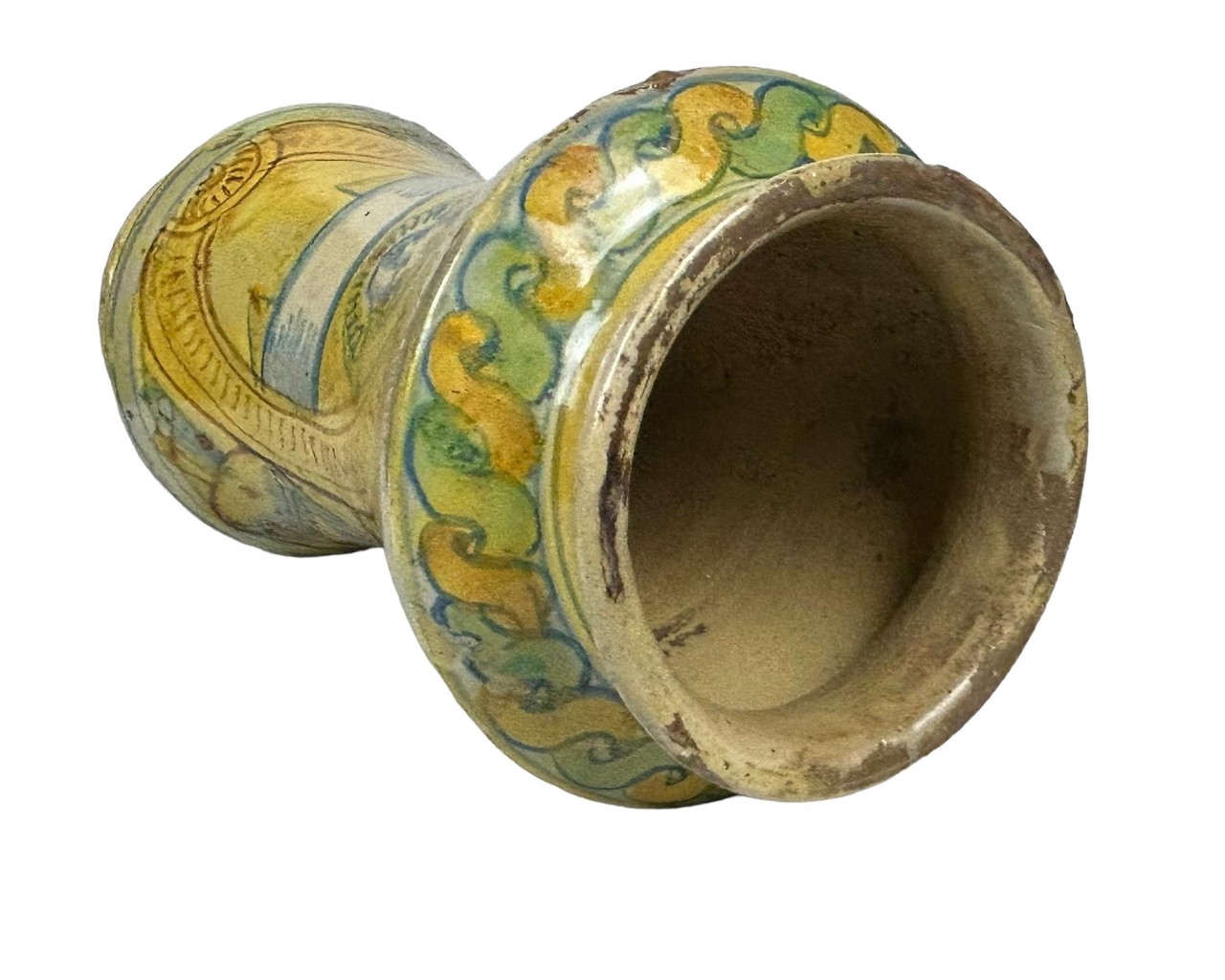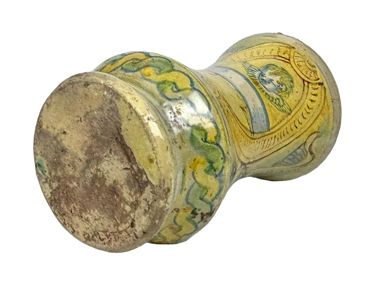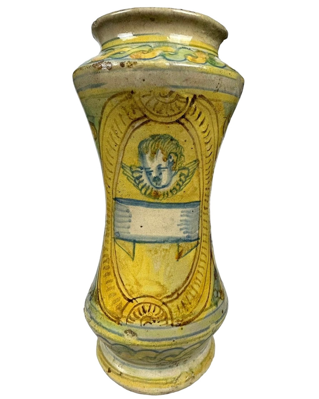 ALBARELLO DA FARMACIA in maiolica invetriata, decorato da medaglione centrale , raffigurante cherubino e nastro per incidere scrittura , retro decorato da trofei. Sciacca 1680/1710 . h cm 28 x 14
