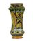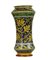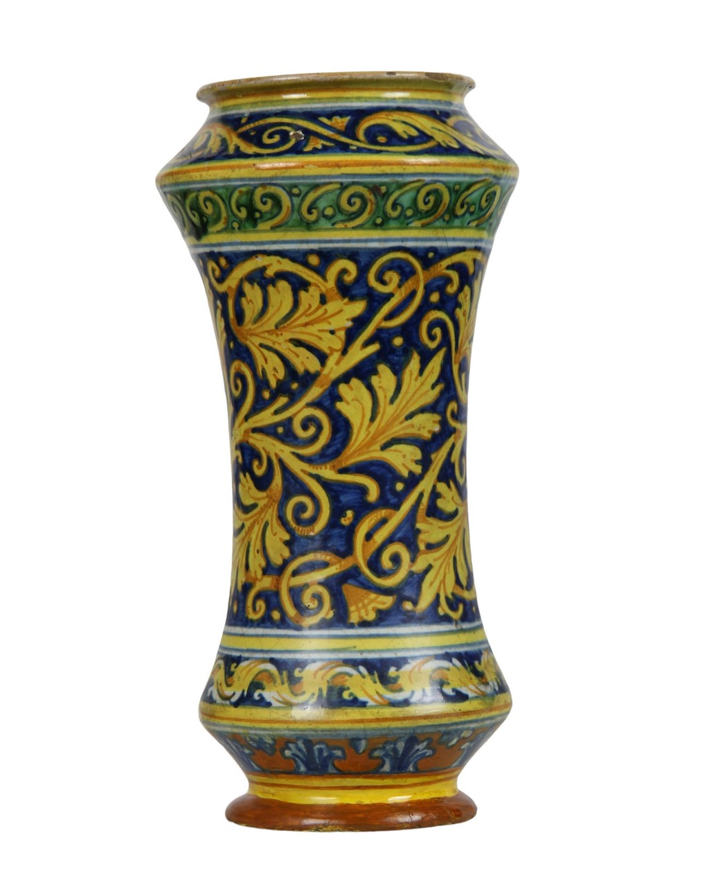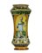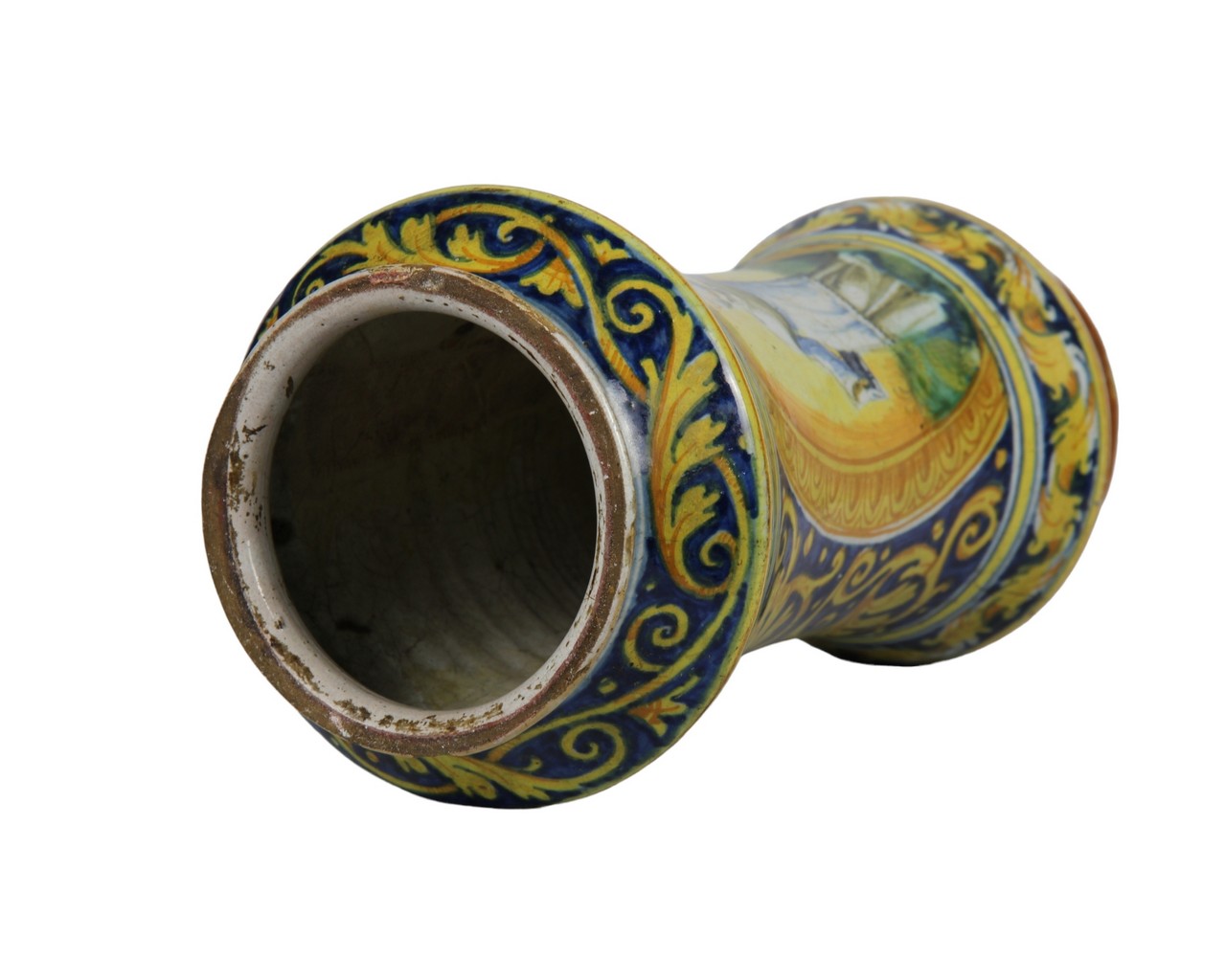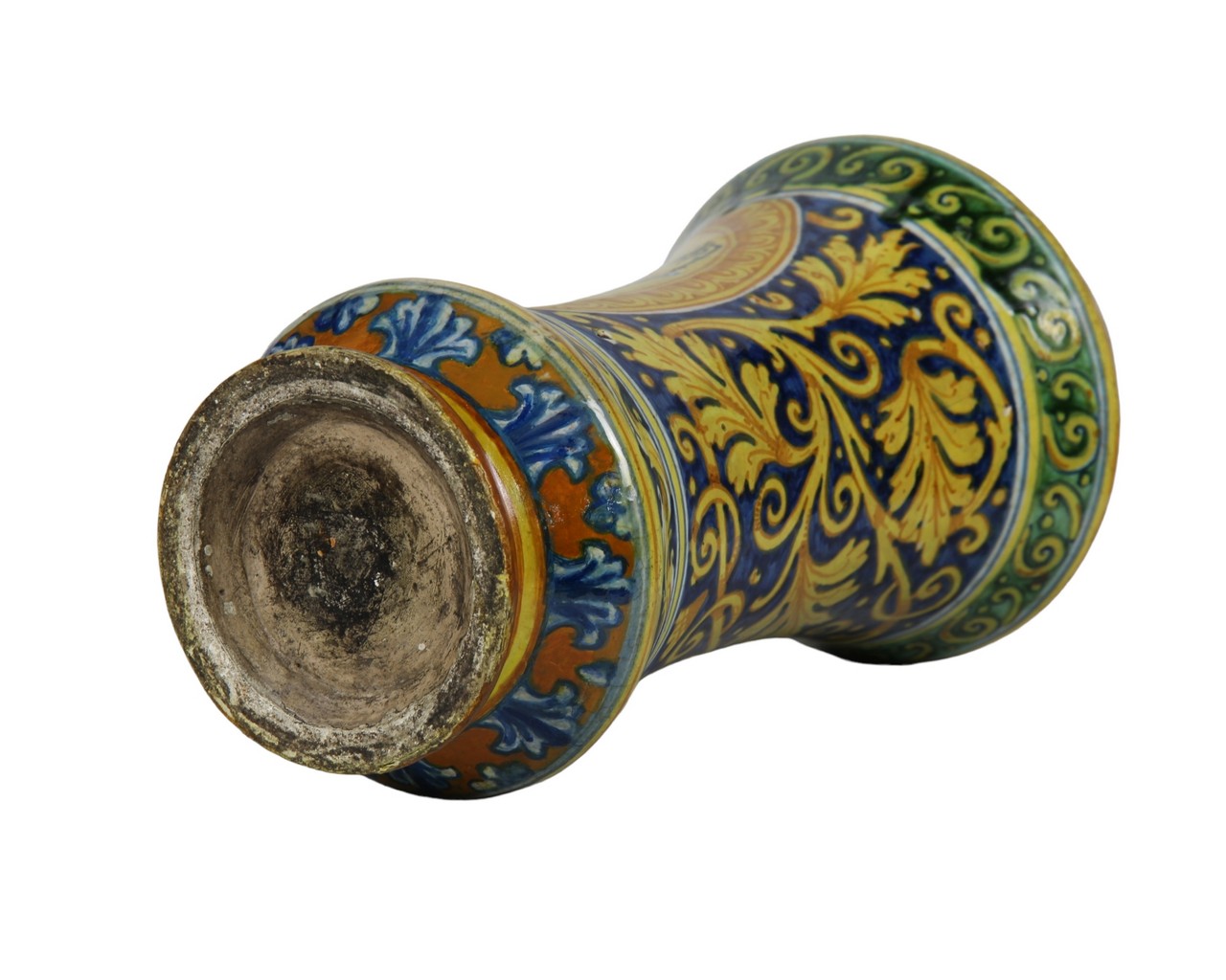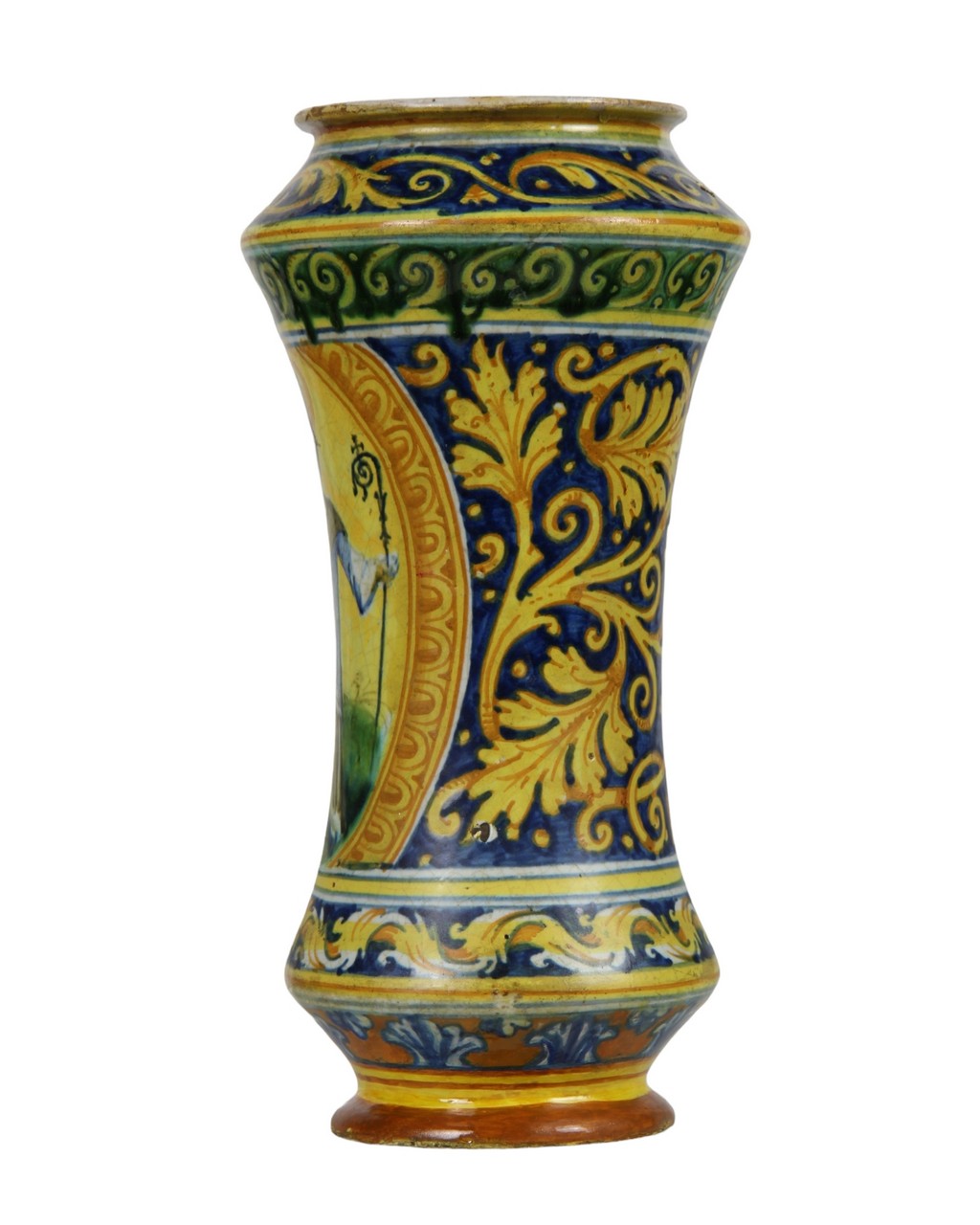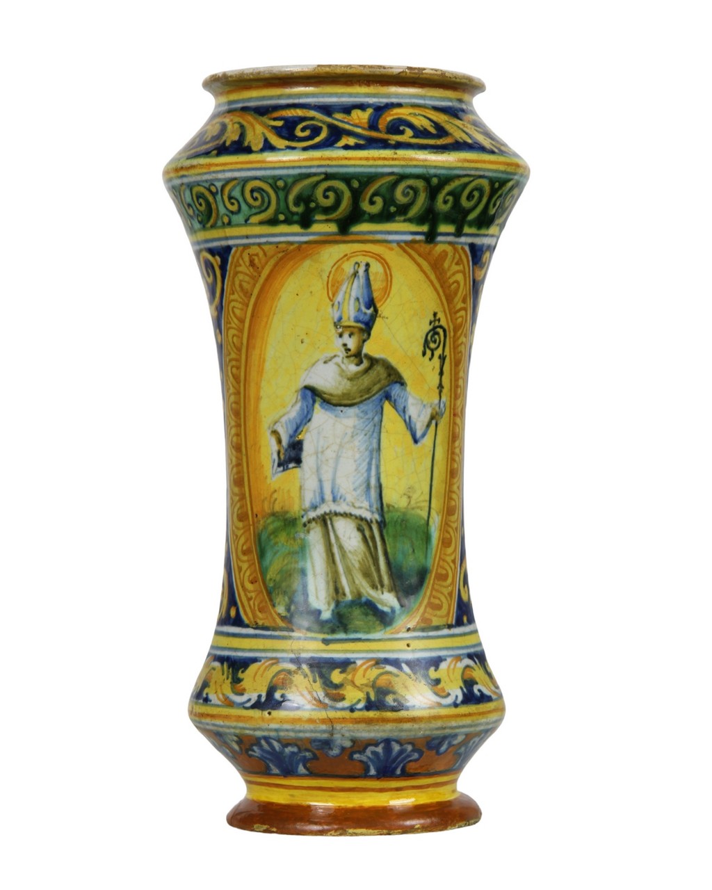 ALBARELLO DA FARMACIA in maiolica invetriata , decorato da medaglione centrale raffigurante vescovo, retro decorato a motivo fogliaceo la particolarità di questo albarello sono le 4 diverse greche che lo decorano a tuttotondo sia alla base che sul collo manifattura Palermo, faentina 1610 circa . vecchio restauro di colore alla base . h cm 30,5 x 15