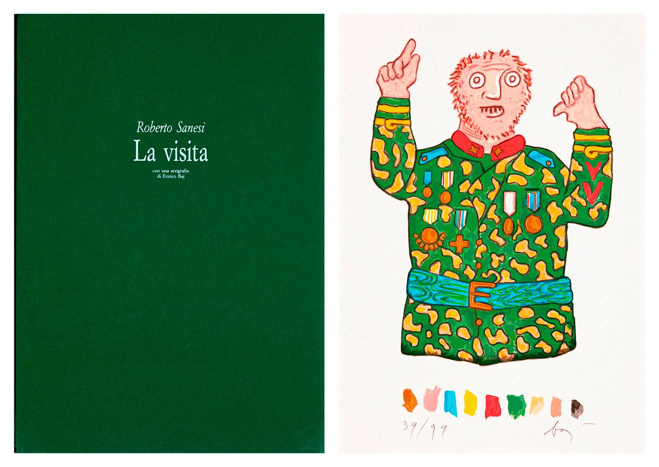 Cartella contenente testo di presentazione di Roberto Sanesi e una serigrafia polimaterica di Enrico Baj recante firma e numerazione (Esemplare 88/99) a matita al fronte
