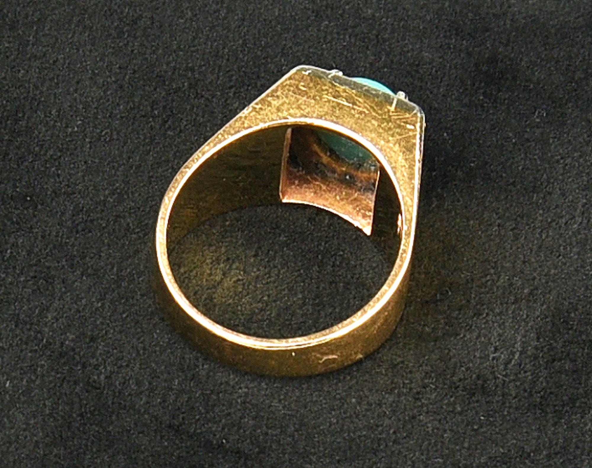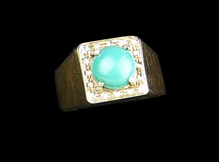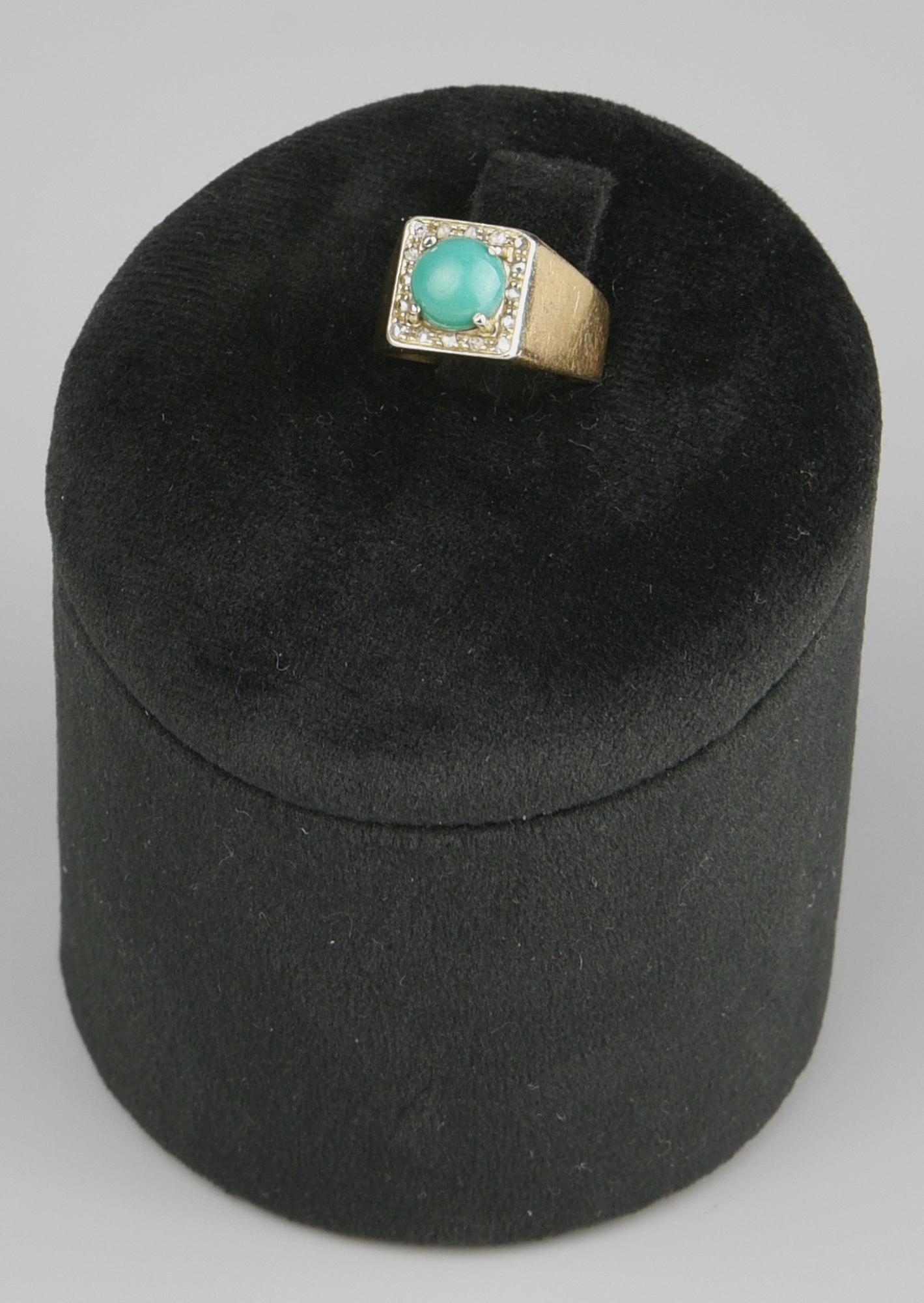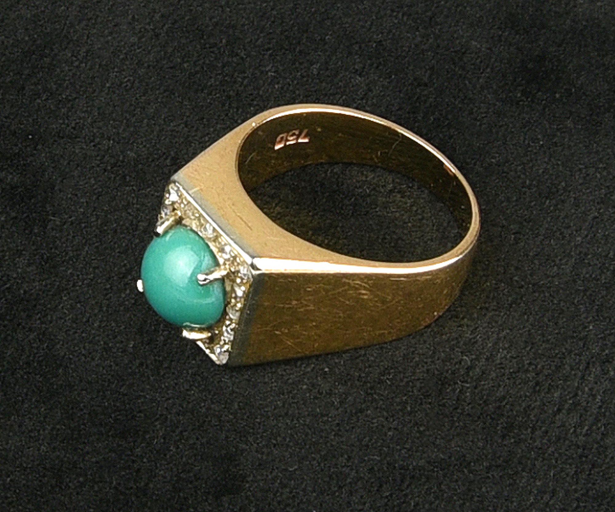 chevalier con turchese e pave' di brillanti in oro giallo 18kt. Peso complessivo gr. 7,30, misura 8