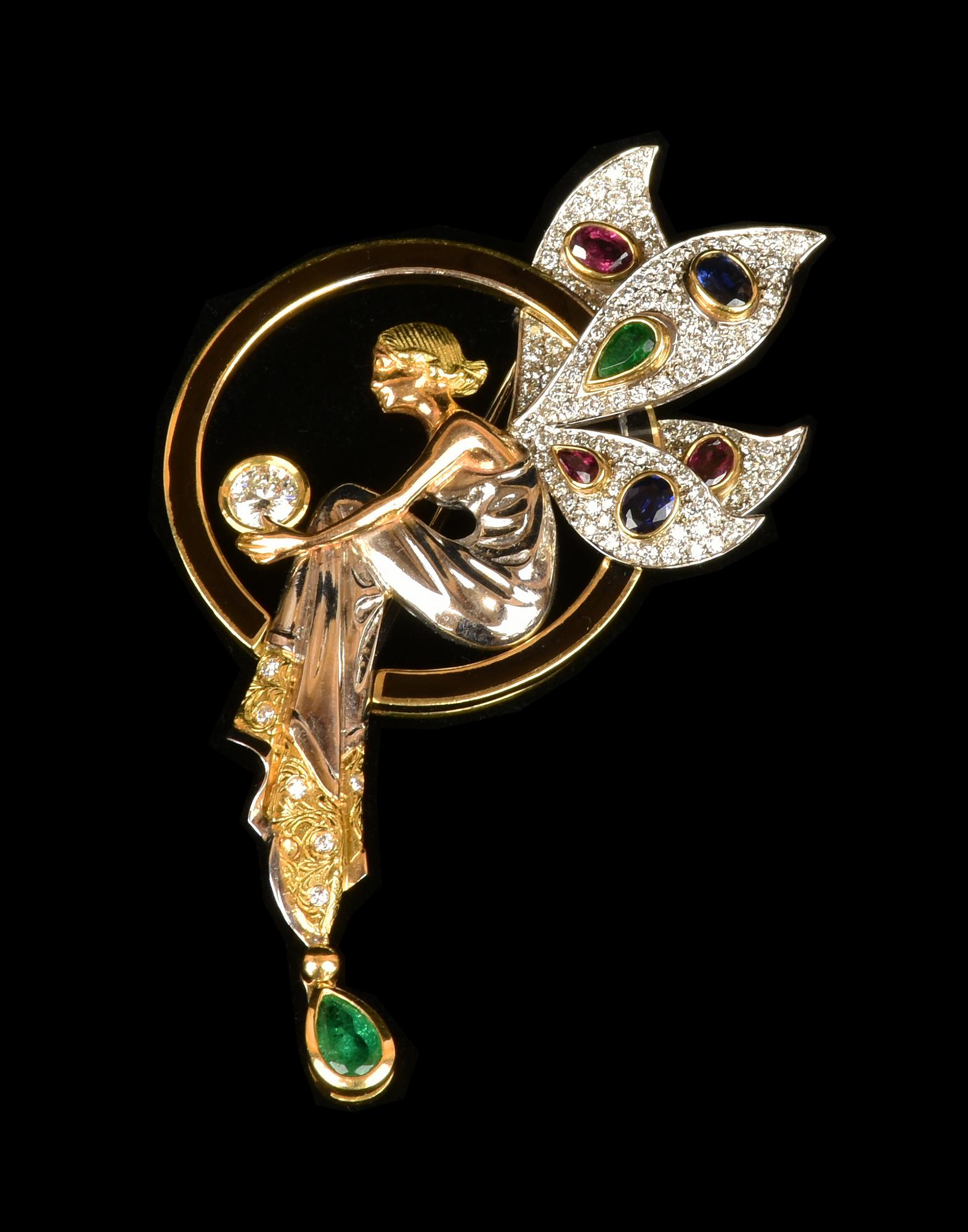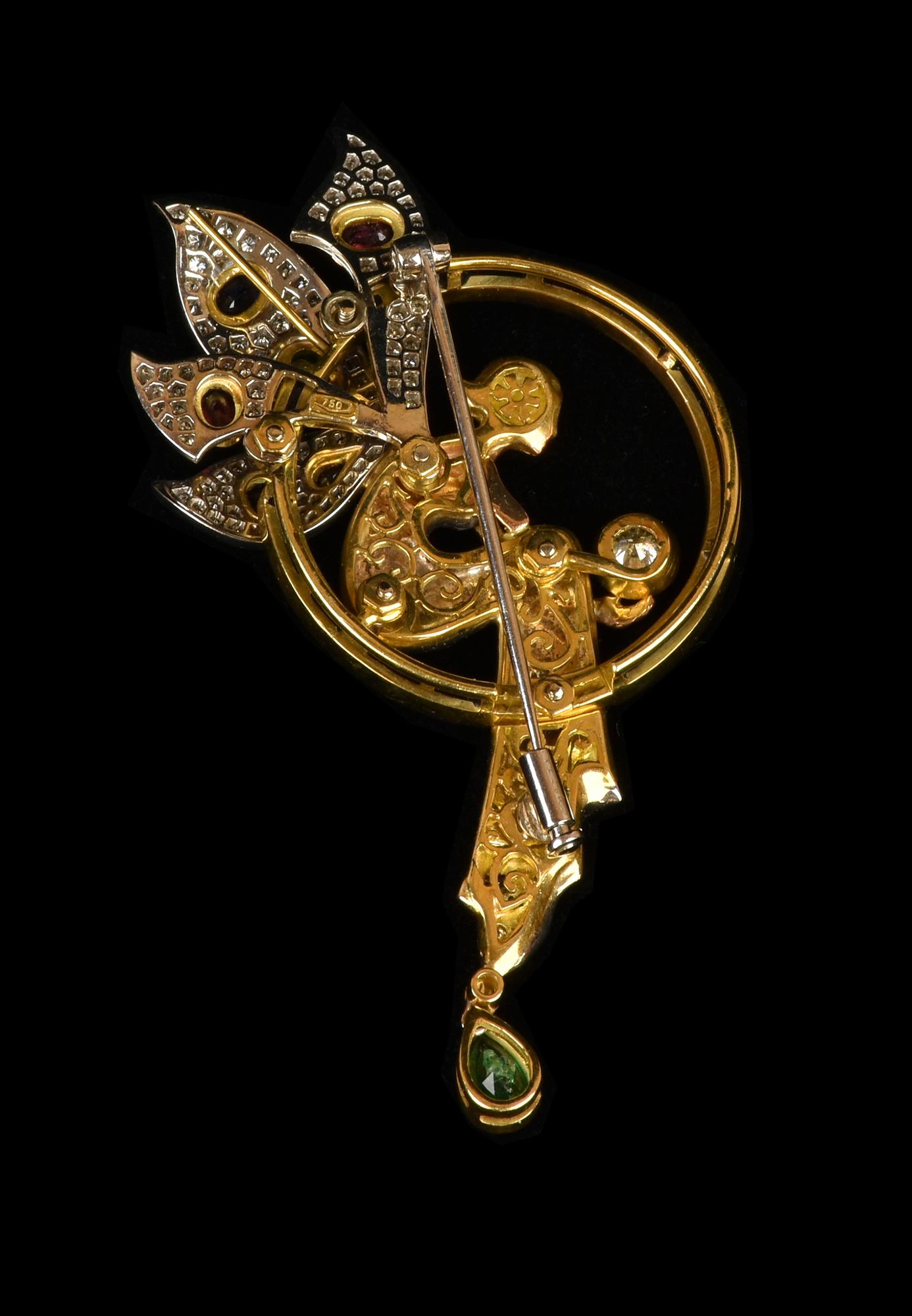 SPILLA IN ORO GIALLO, BIANCO, DIAMANTI E PIETRE DI COLORE realizzata a forma...