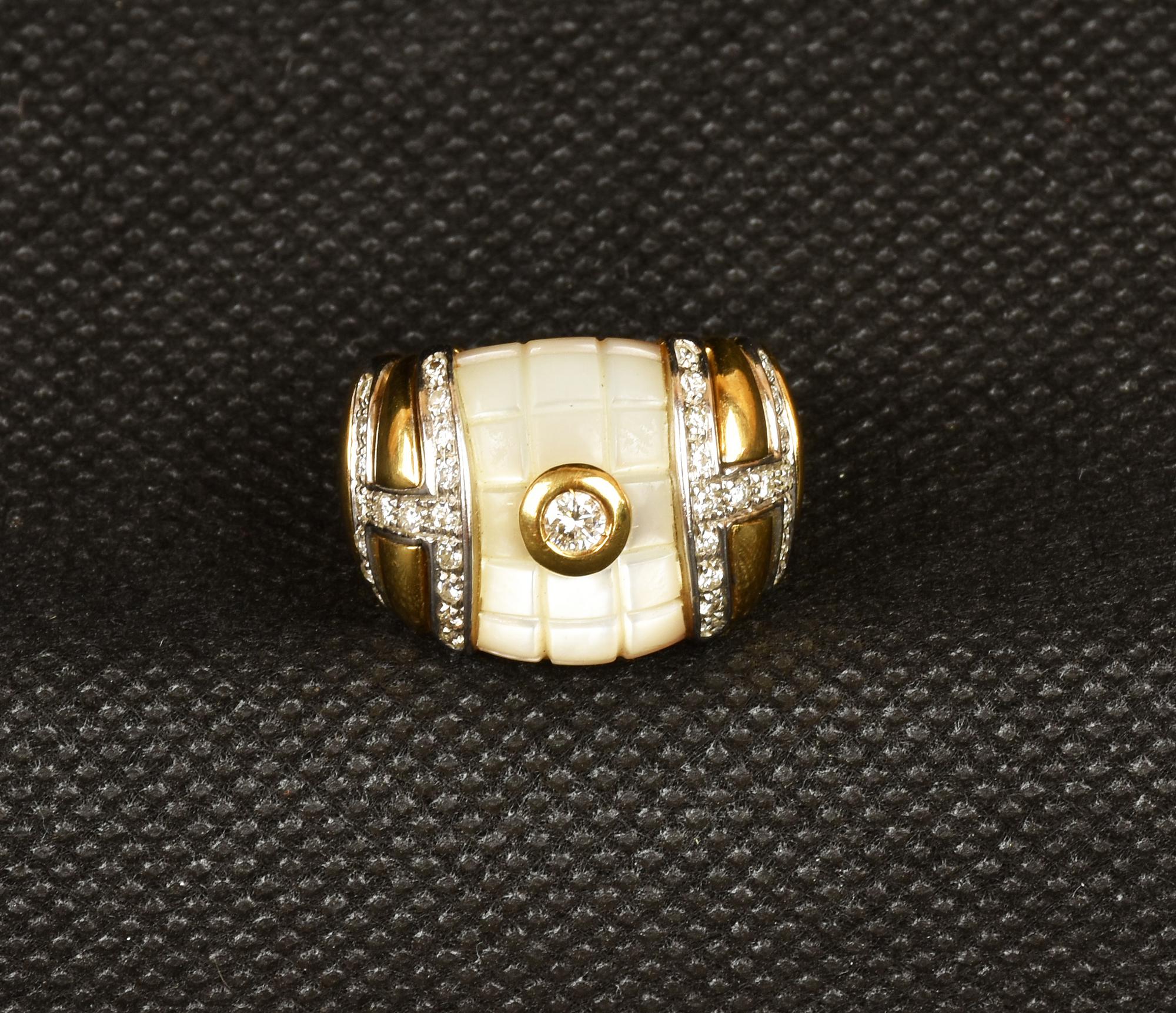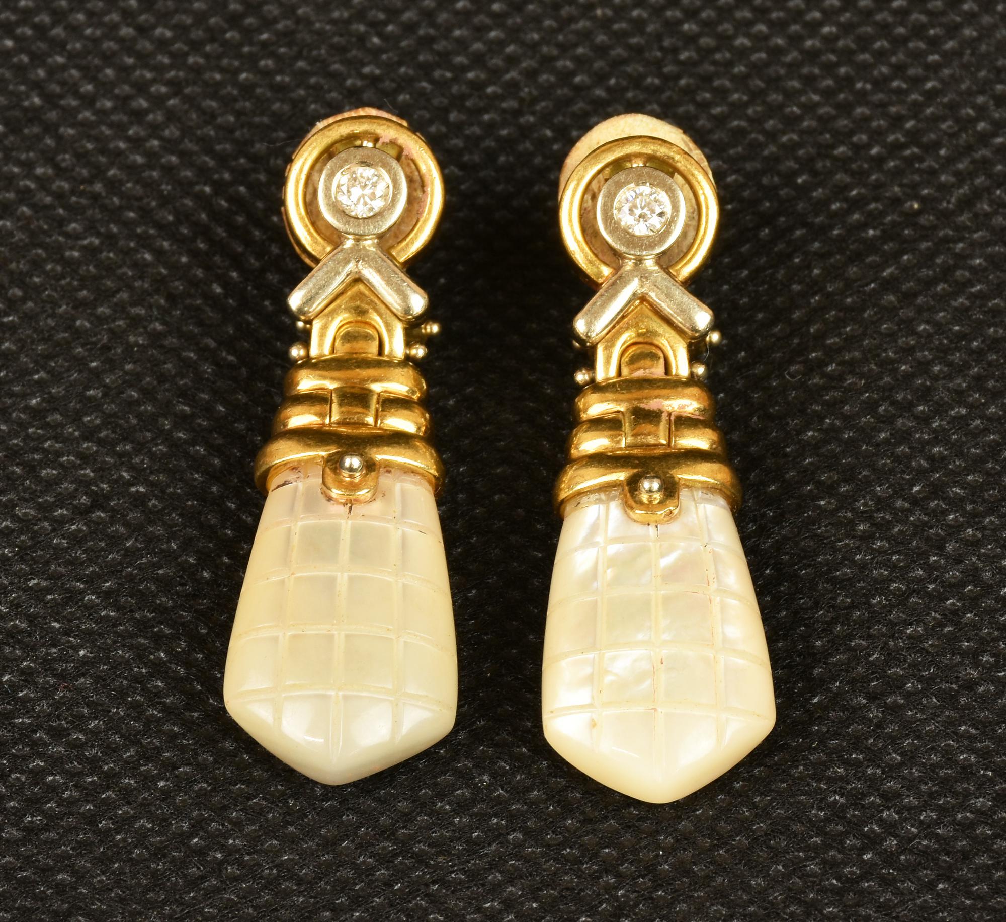 rispettivamente composta da anello a fascia decorato al centro da una madreperla incisa e diamanti di forma rotonda per ct. 0.50 circa, mis. 12,5, e paio di orecchini pendenti a clip composti da madreperla incisa e coppia di diamanti rotondi a brillanti per ct. 0.20 totali circa, punzone 750, grammi 33
