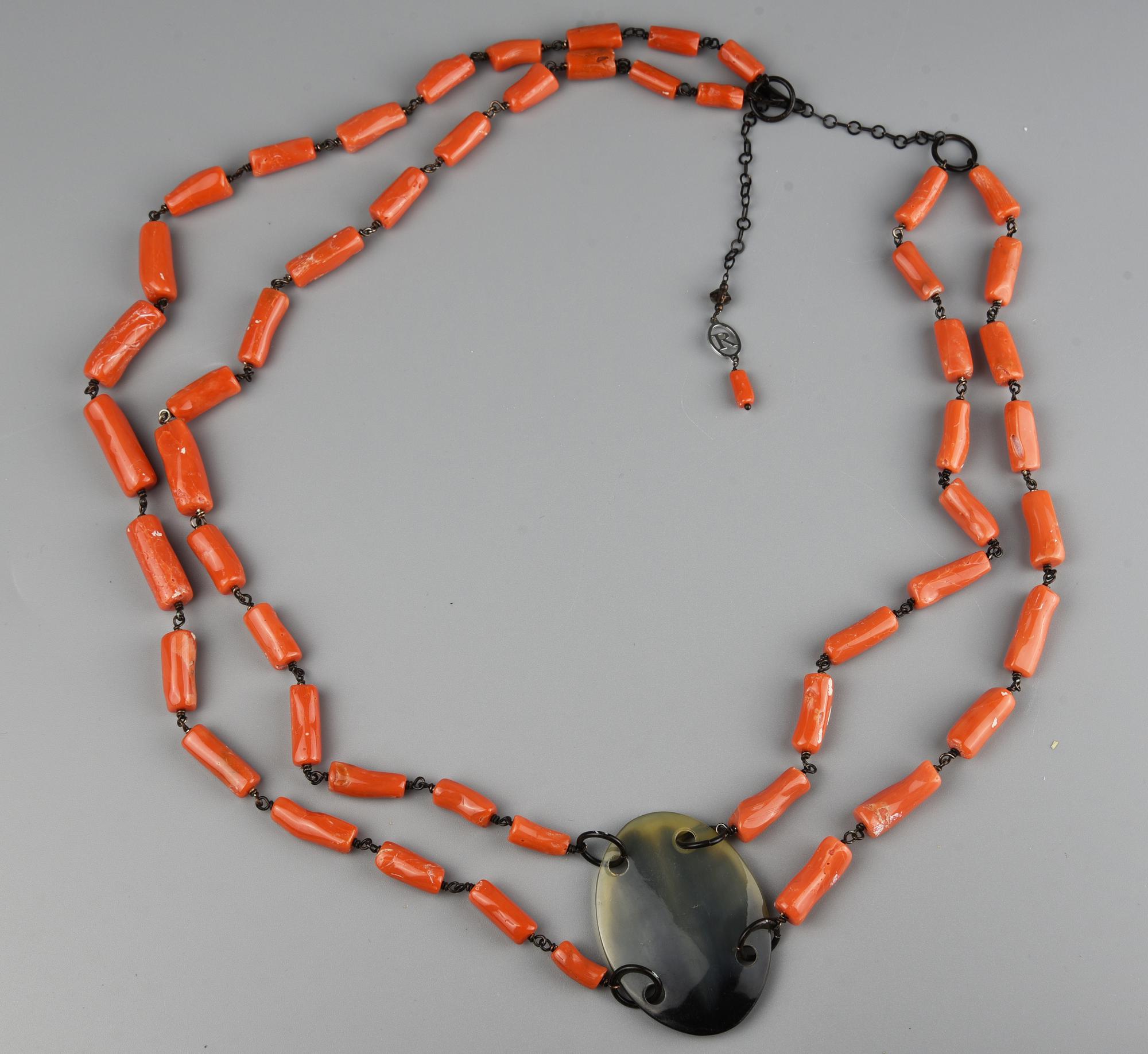 Manifattura ROVIAN. Montatura in argento 925/1000 a due fili di cilindretti di corallo Cerasuolo con elemento centrale in corno. Lunghezza cm 80. Diametro corallo mm 7,5. Elemento centrale in corno mm 38x51.