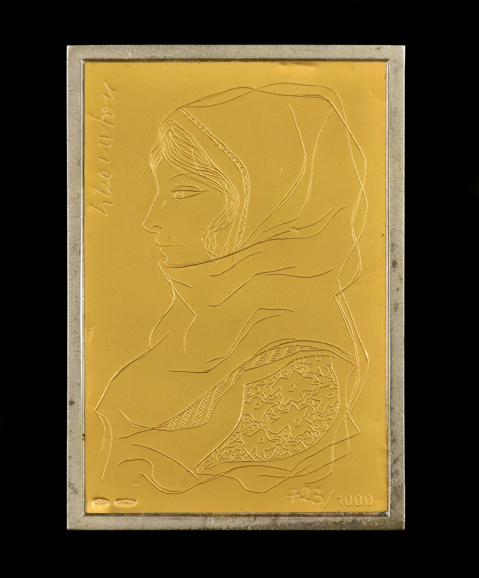 realizzata su una lastra in argento 925/1000 con applicata lamina in oro 999/1000 raffigurante un'incisione numerata 723/1000, autore Liberatore, misure cm 6,5x4,5, grammi 48,43