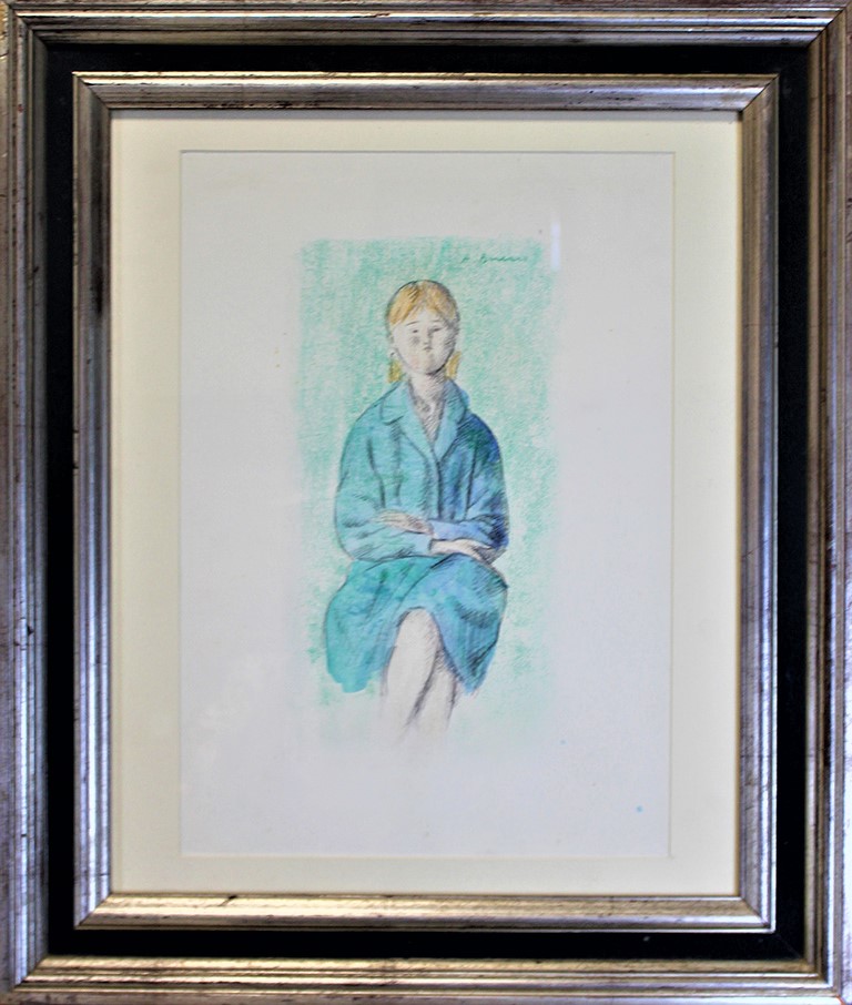 ANTONIO BUENO, "Figura ragazza seduta", 1977, Disegno, matita, pastello e acquerello su cartoncino, Dim. 48 x 34, Al verso firmato e datato, Opera archiviata presso l'Archivio Isabella Bueno al N° AB017/022 in data 12/07/2022