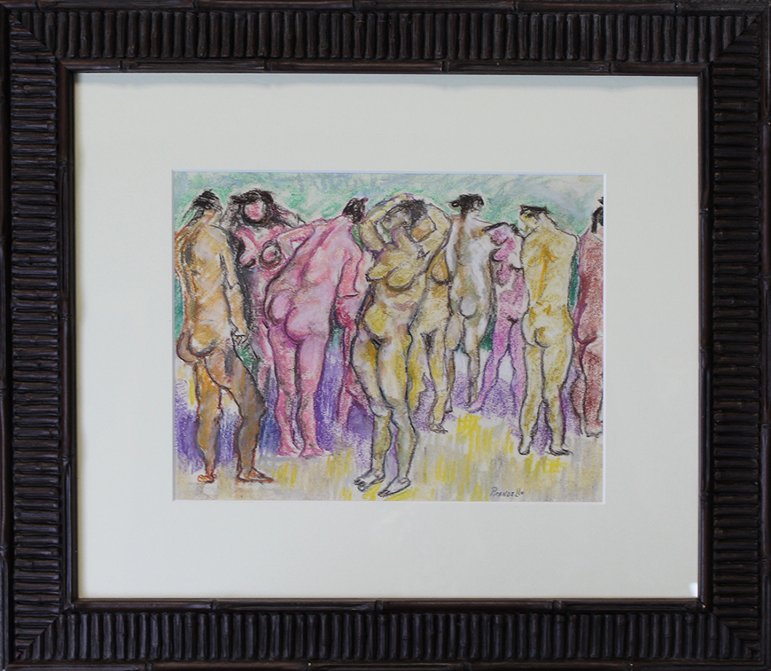 FAUSTO PIRANDELLO, "Dieci bagnanti", 1968, Pastelli su carta, Dim.22x28, Al fronte firmato in basso a destra, Opera con autentica e archiviata presso la fondazione Fausto Pirandello al N° FFP0522003 in data 05/05/2022, Opera con cornice