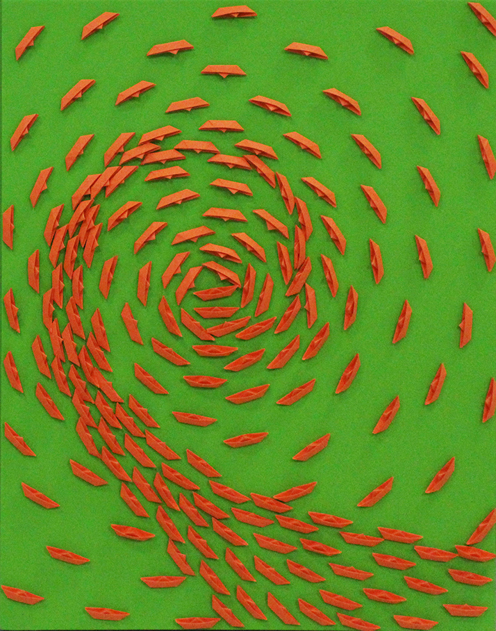 RICCARDO GUSMAROLI, "Vortice arancio", 2022, Barchette di carta su tela, Dim. 54x46, Al verso: firma, Opera archiviata presso l'archivio Gusmaroli al N° I059 in data 16/11/2022