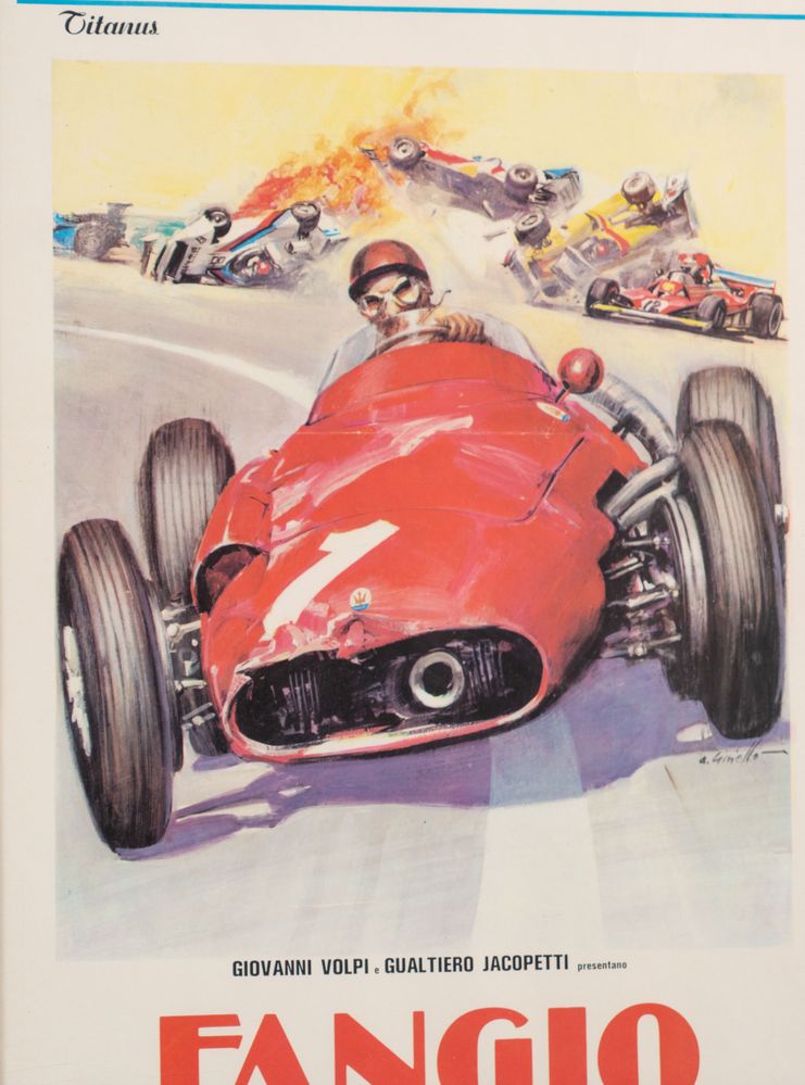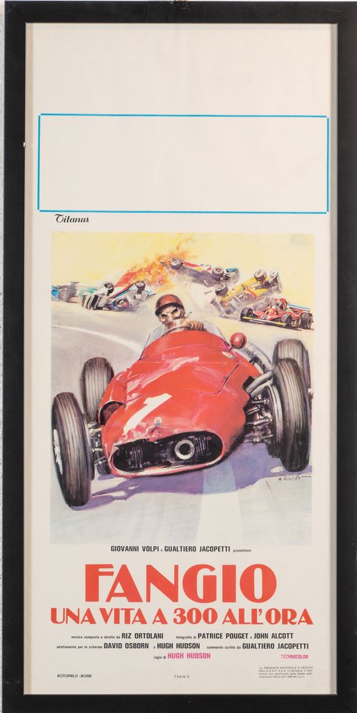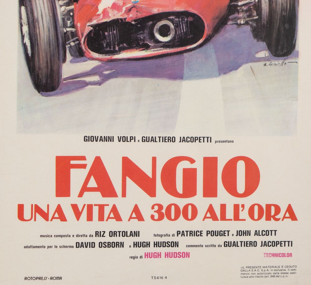 Locandina originale del film documentario “Fangio una vita a 300 all’ora” del 1981, sulla vita del grande campione argentino.