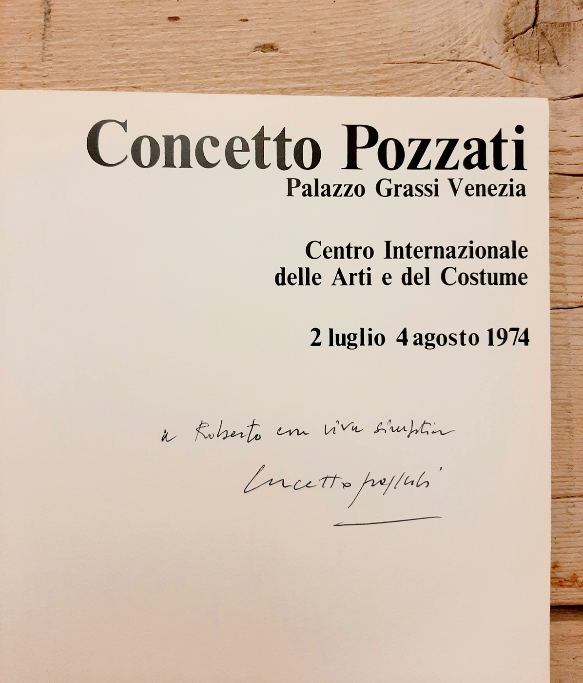 Catalogo della mostra personale dedicata a Concetto Pozzati, Venezia, Palazzo Grassi, Centro Internazionale delle Arti e del Costume, dal 2 luglio al 4 agosto 1974. Brossura con copertina in cartone, pagine 50