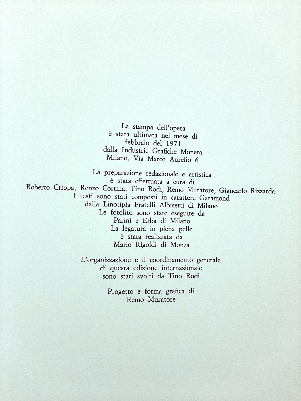 Monografia di pregio dedicata a Roberto Crippa, edita dalla Galleria d'Arte Cortina. Volume impreziosito da dedica del gallerista Renzo Cortina in data maggio 1977. Copertina cartonata in piena pelle con cofanetto editoriale (segni di usura solo nel cofanetto), in folio-carré, 58 pagine di testi critici trilingue (italiano/francese/inglese). di Michel TAPIE, Victor BRAUNER, André PIEYRE DE MANDIARGUES, Alain JOUFFROY, Franco RUSSOLI, Marco VALSECCHI, Guido BALLO, Nicolas CALAS e Laurence ALLOWAY. Ampiamente illustrato a colori e in bianco e nero con veline intercalate. Edizione di 500 esemplari (copia 375). Esemplare ben conservato fatta eccezione per cofanetto.