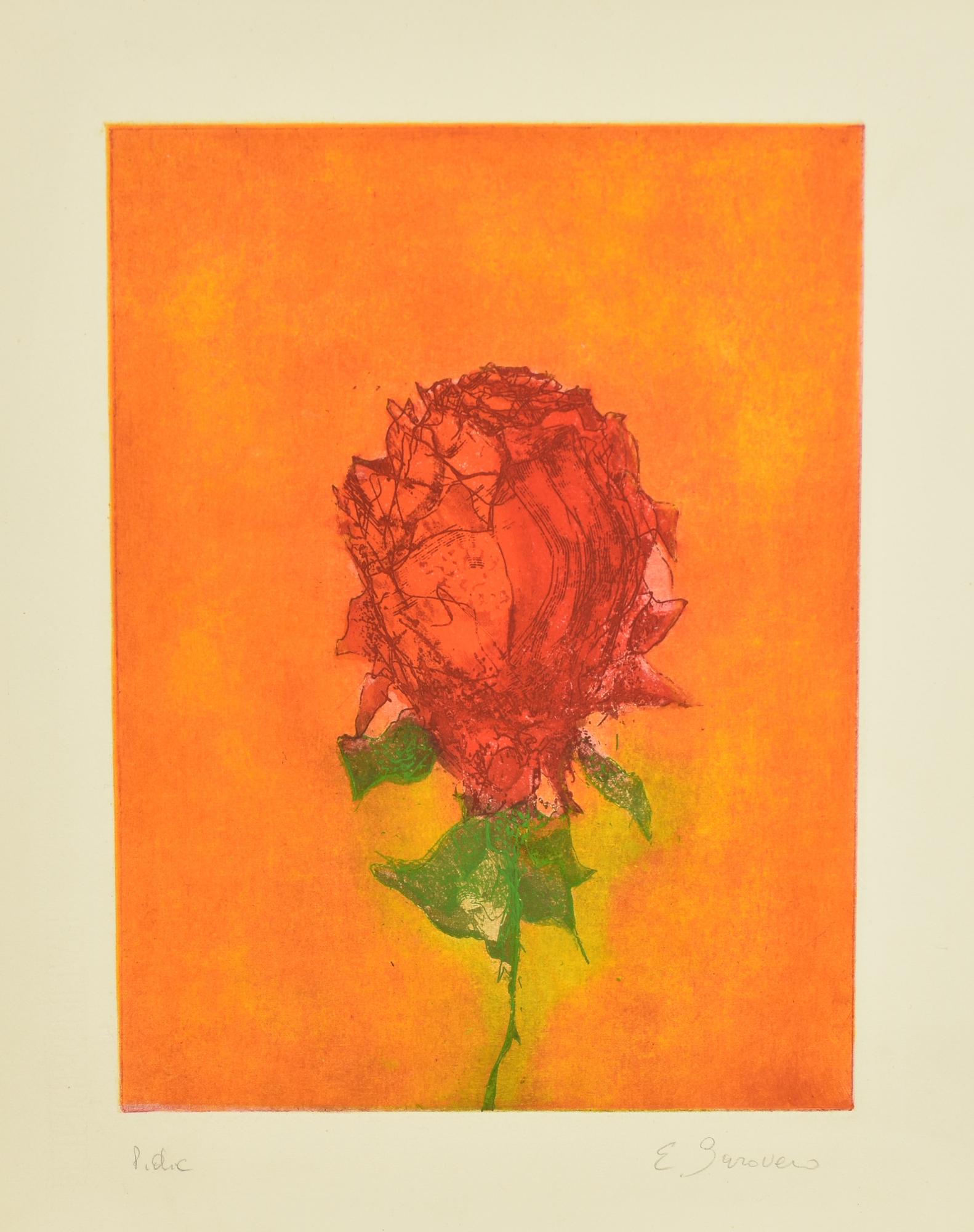 Ermanno Barovero ROSA SU SFONDO ARANCIO acquaforte- acquatinta su carta...