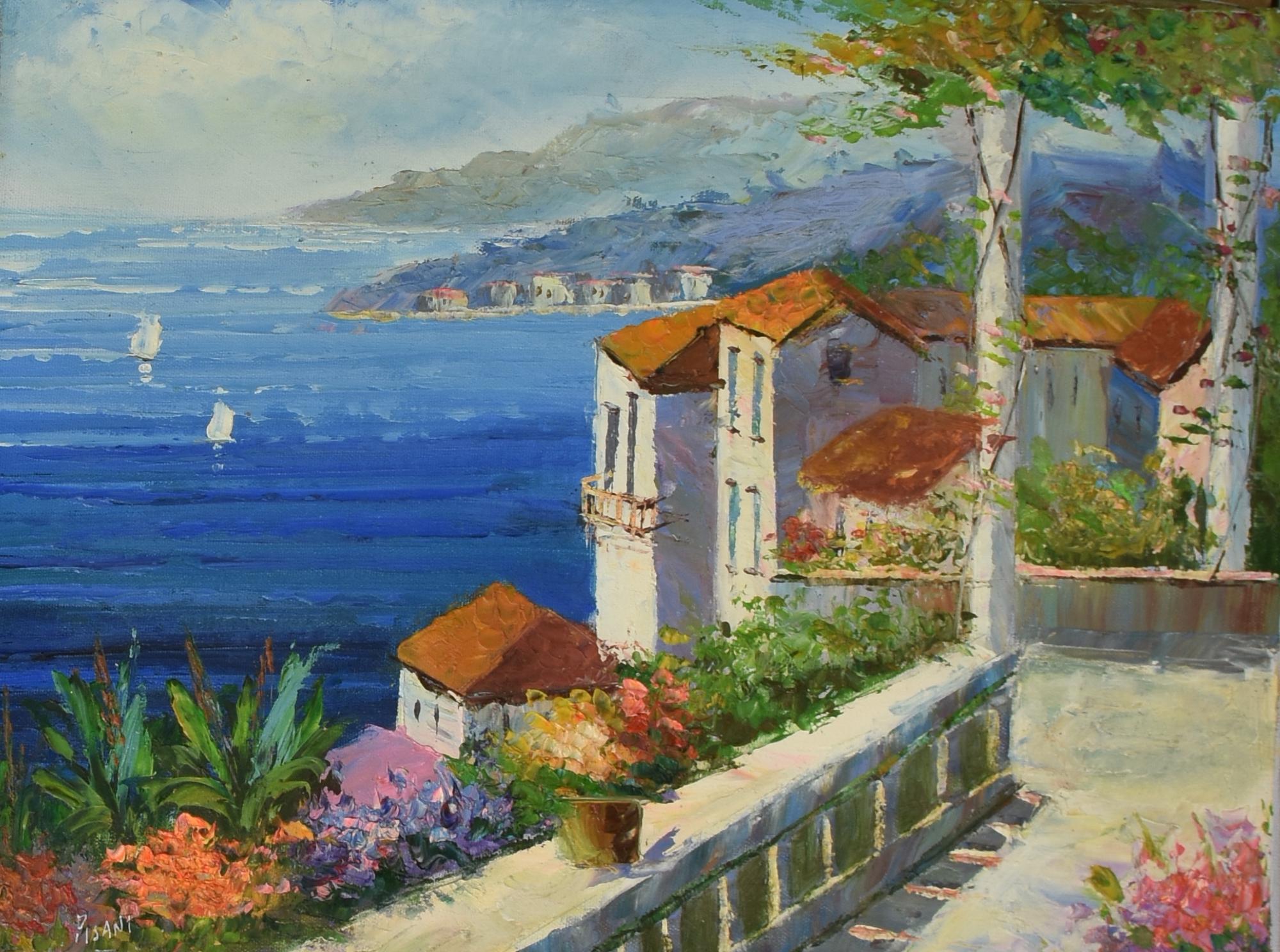 A. Pisani PAESAGGIO LIGURE olio su tela, cm 30x40 firma sul retro: firma,...