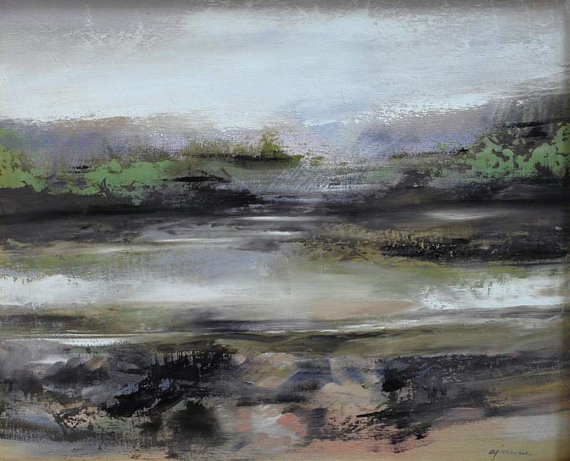 Giuseppe Ajmone (Carpignano, 1923-Romagnano 2005) FIUME ALLA FOCE Olio su tavola, cm. 33x42 Firma in basso a destra. Sul verso: firma e titolo; timbro Studio d’Arte Mercurio, Milano. Autentica Archivio fotografico Generale di Giuseppe Ajmone.