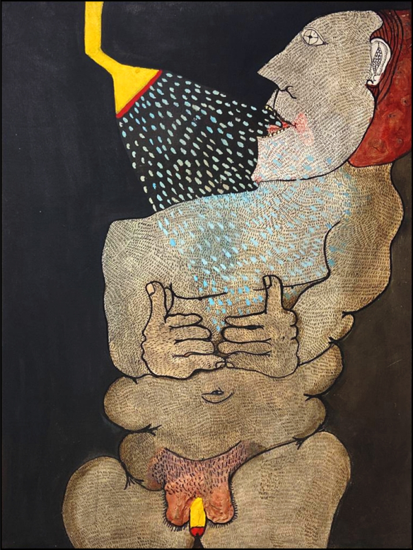BELLAMI PIETRO Massa Carrara 1944 “Adamo è sotto la doccia” tecnica mista su carta intelata cm 73x100 del 1972. Sul retro titolo, firma e data.