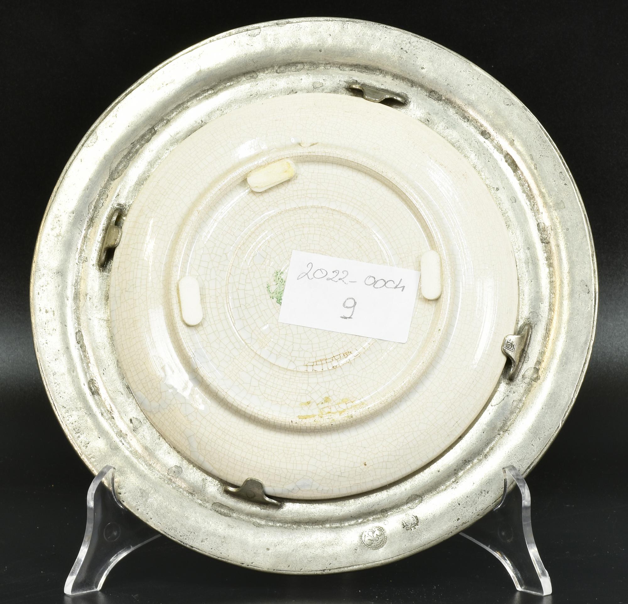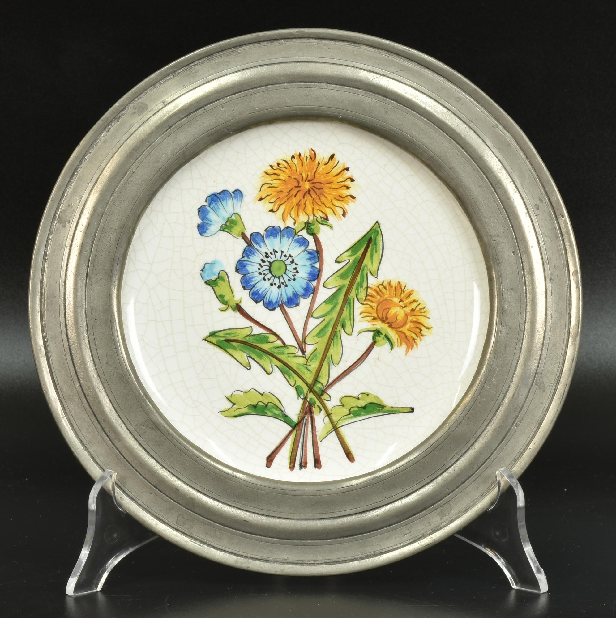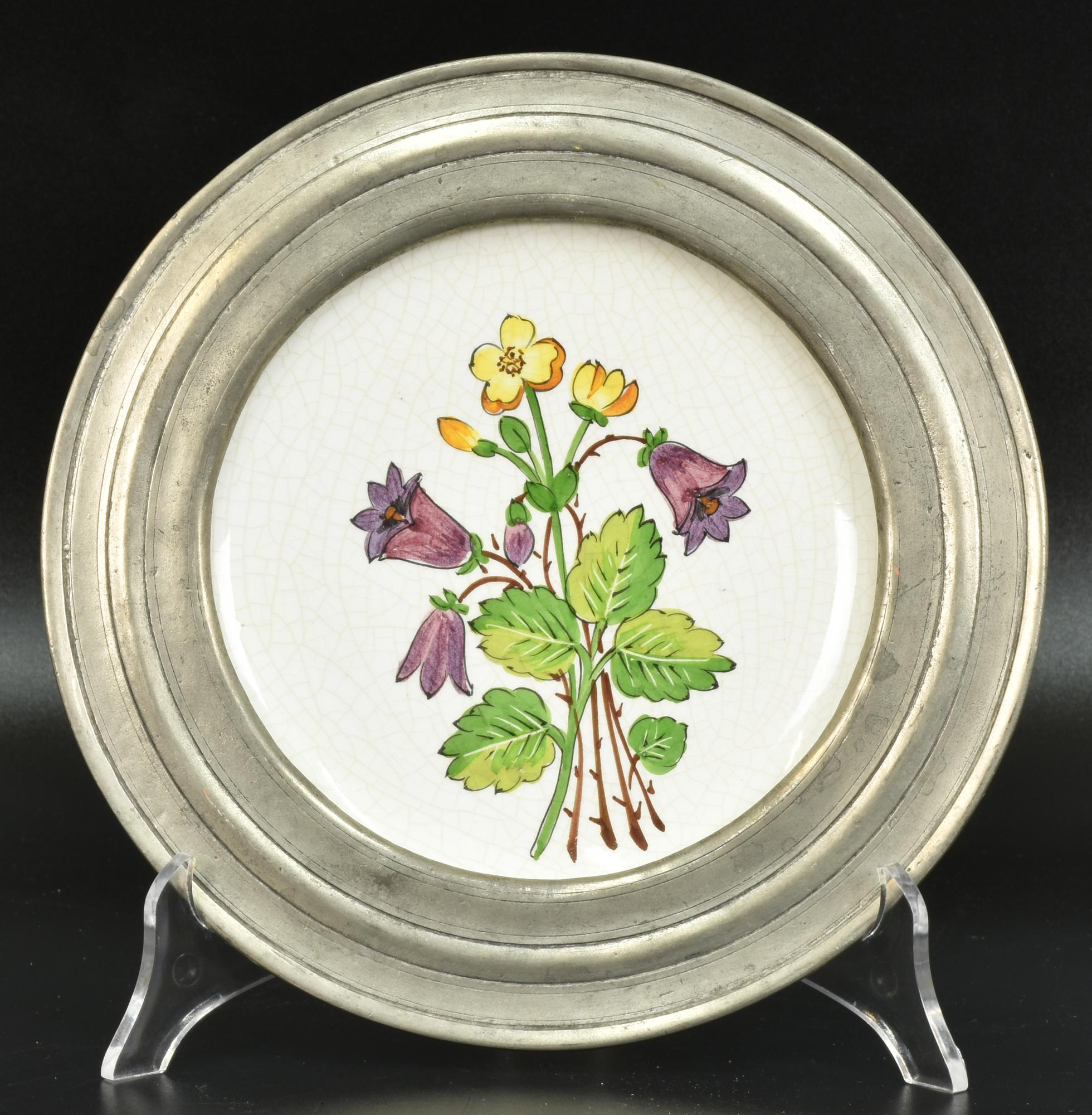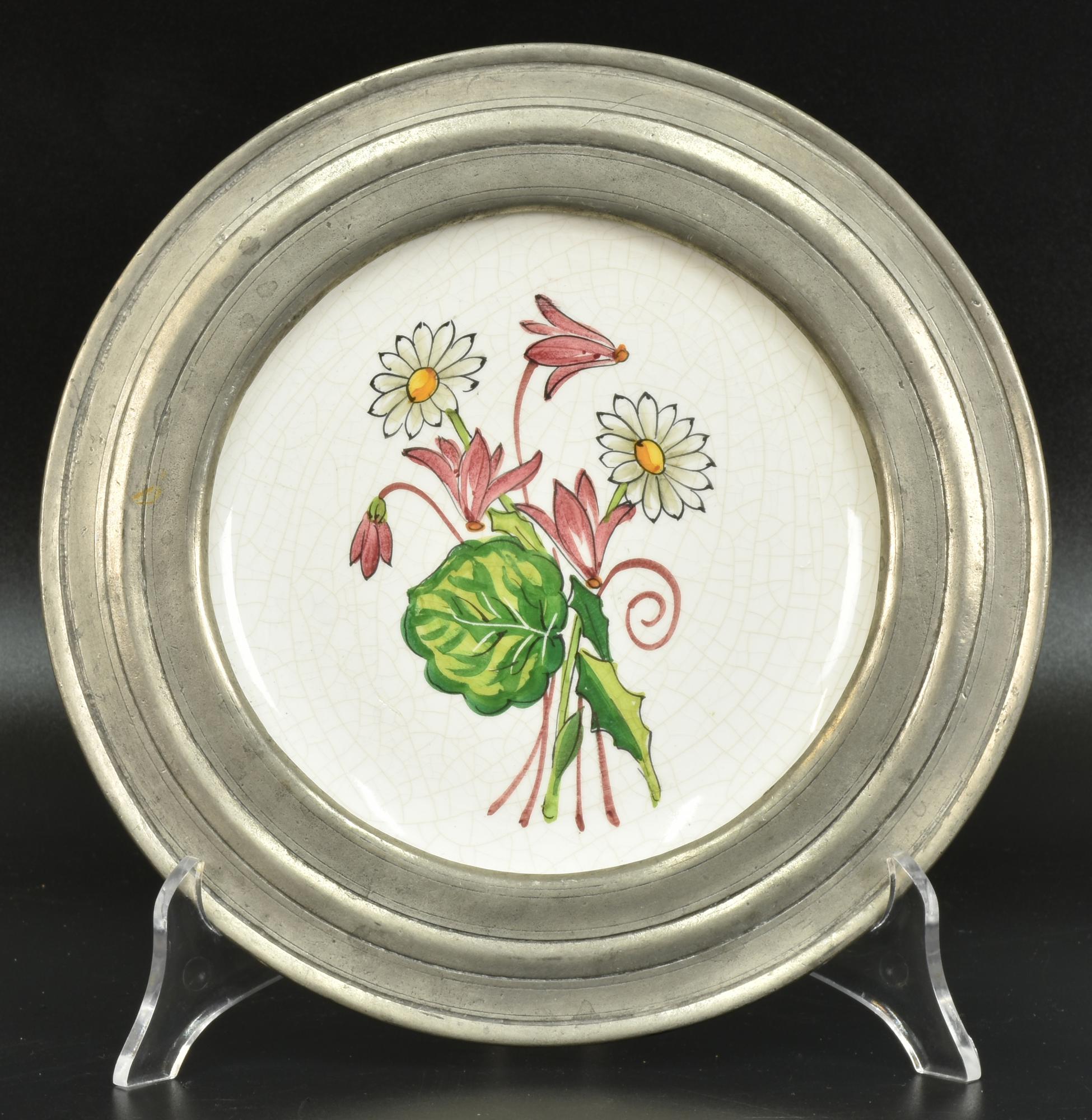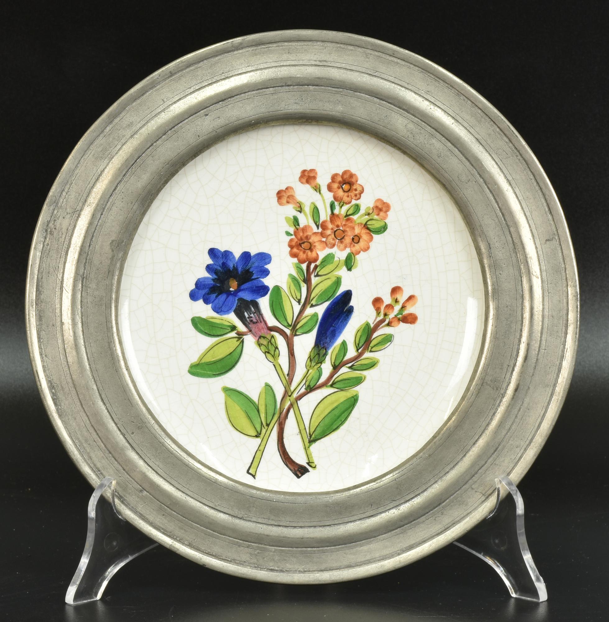 LOTTO DI 5 PIATTI IN CERAMICA E PELTRO decorati con motivi floreali diam cm 23