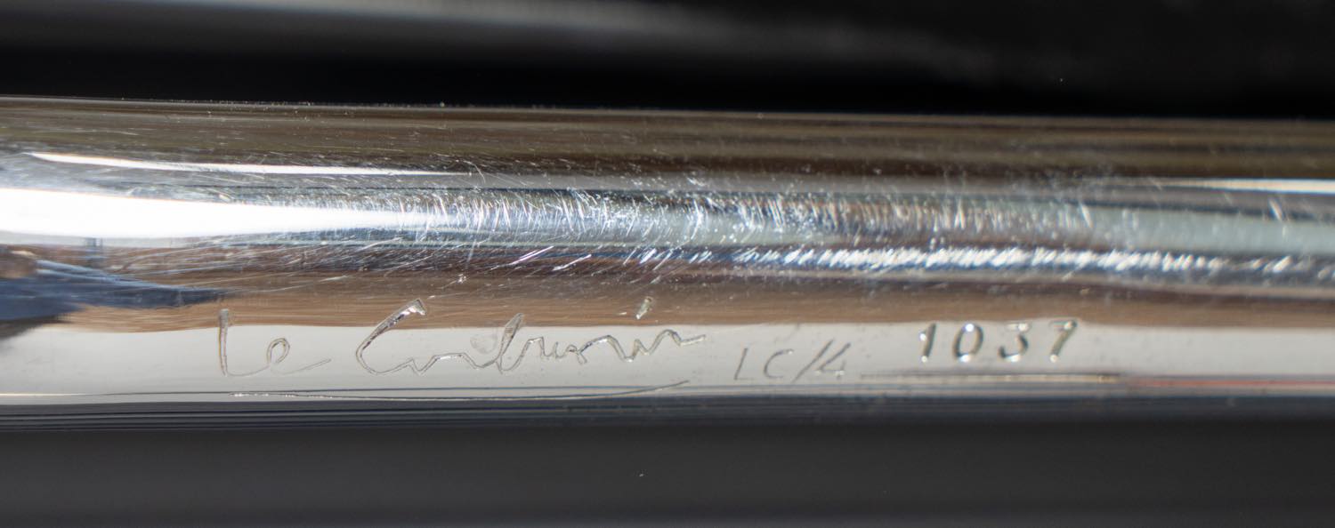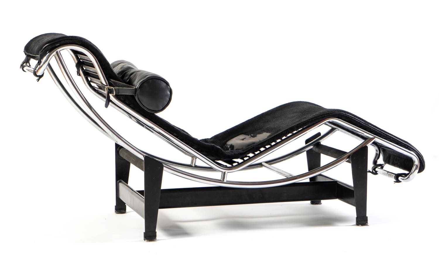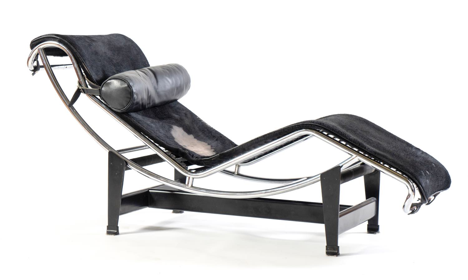 Scocca in metallo cromato poggiante su struttura a quattro piedi nera, seduta rivestita in cavallino, reca al retro della testiera iscrizione incisa con firma “Le Corbusier LC/4 1037”, H cm 63x160x56.5 – H seduta cm 29 (usure – difetti al rivestimento)