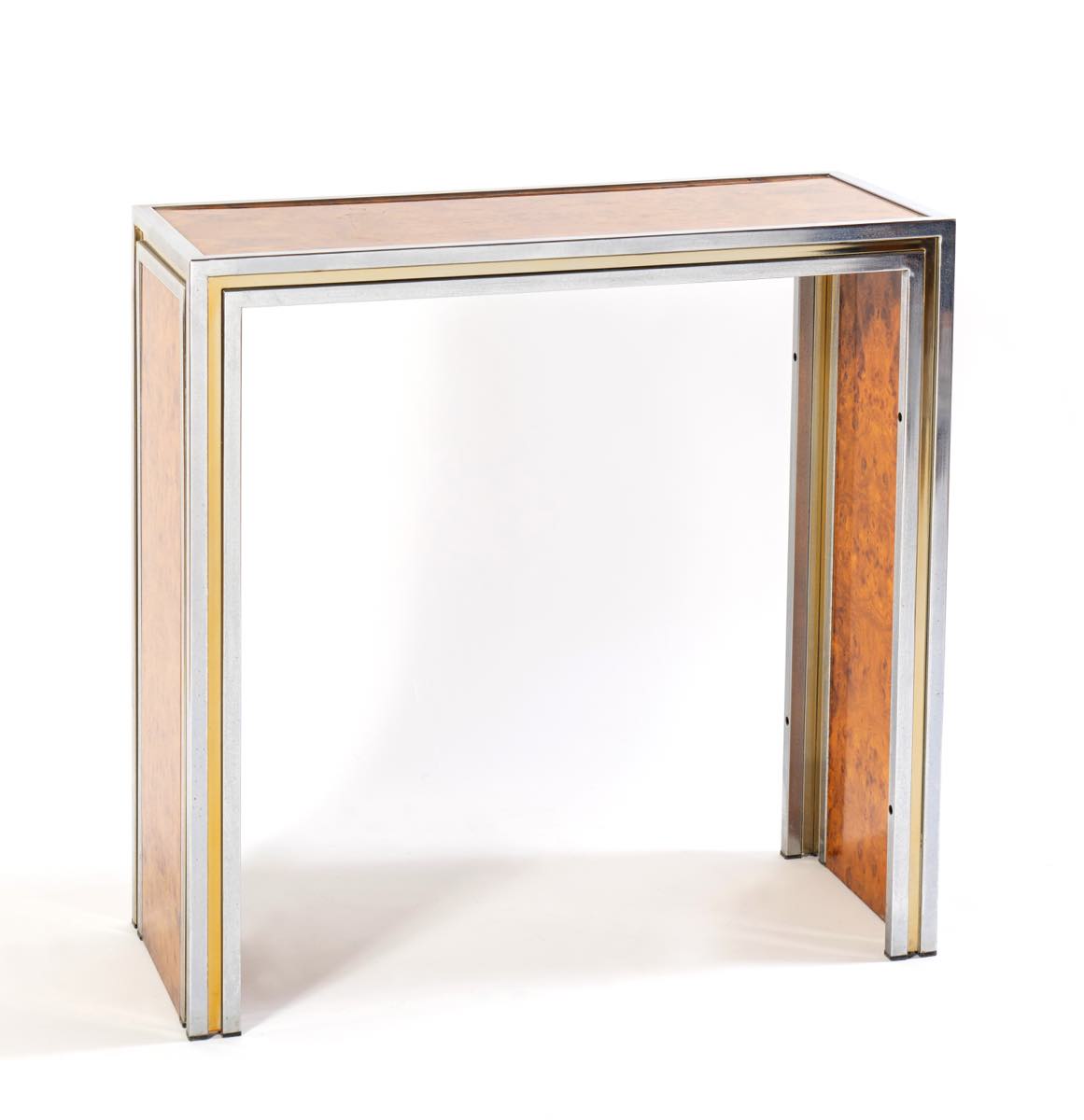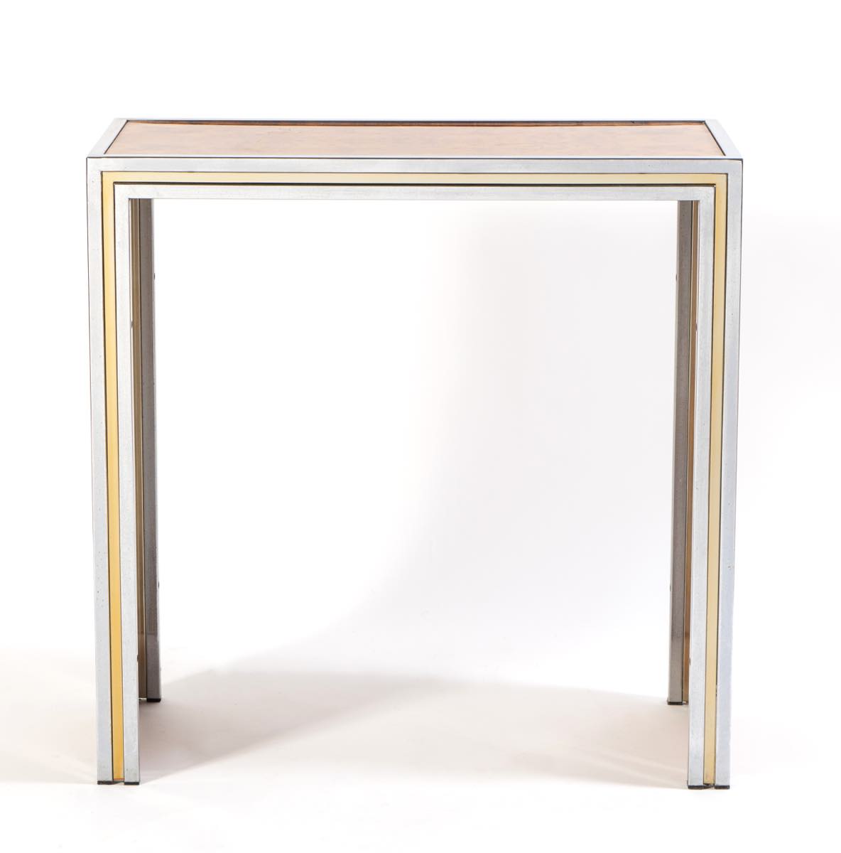 Struttura in metallo cromato con profili in ottone centrati da pannelli in radica lucida, H cm 85.5x85x35 (lievi usure – ossidazioni al metallo)