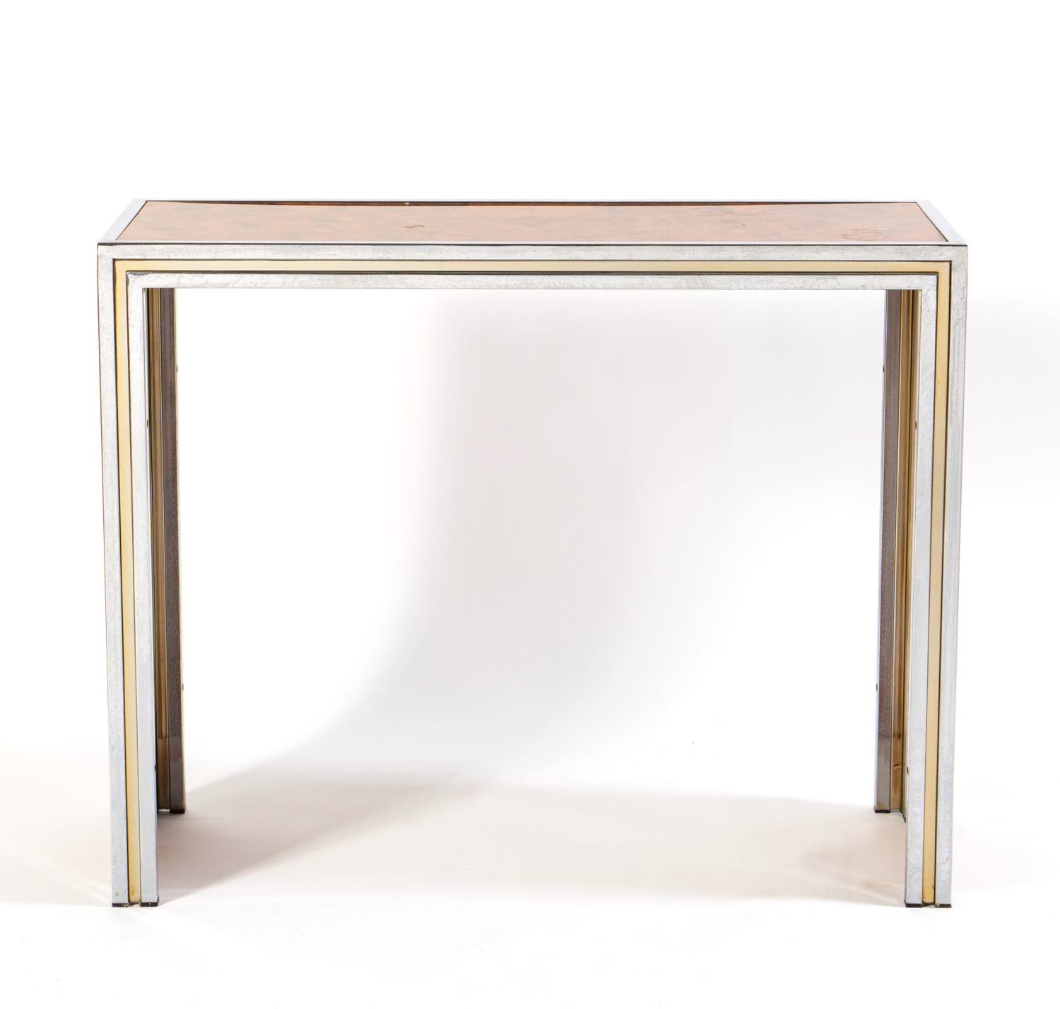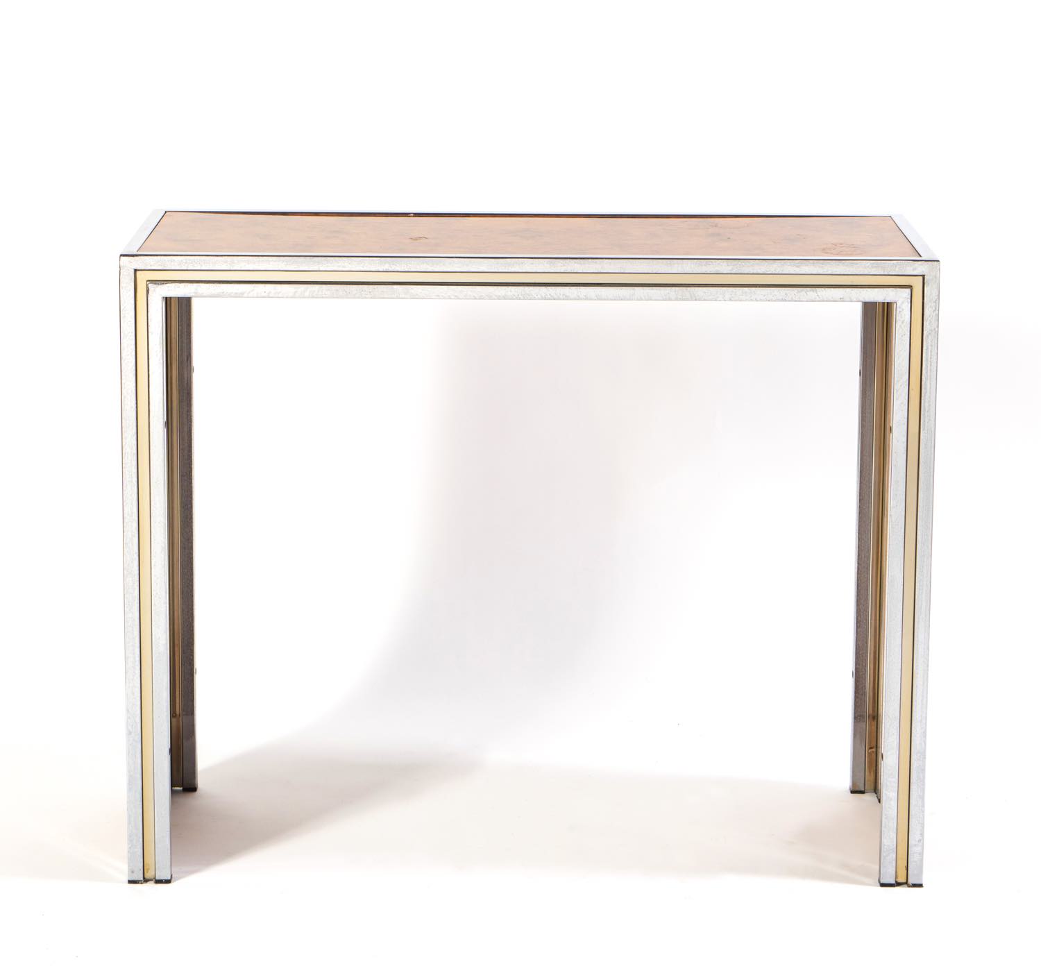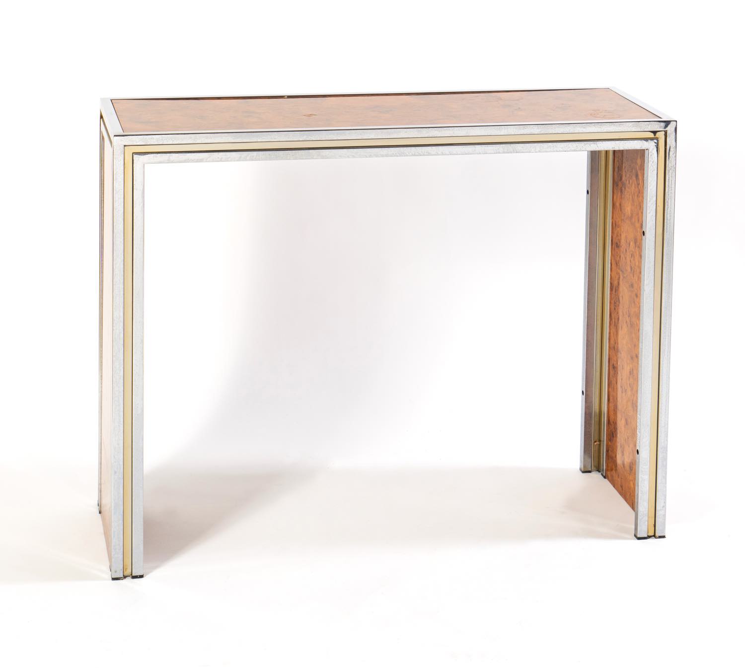 Struttura in metallo cromato con profili in ottone centrati da pannelli in radica lucida, H cm 84x104x35 (lievi usure – ossidazioni al metallo)