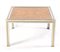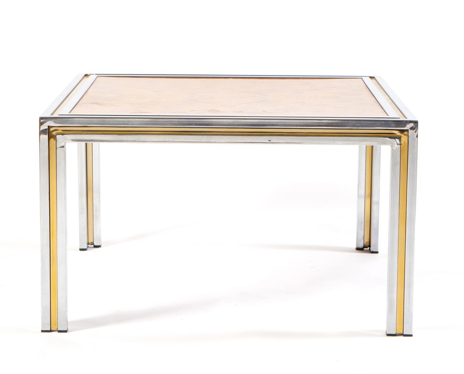 Struttura a sezione quadrata in metallo cromato con profili in ottone centrati da pannelli in radica lucida, H cm 46x80x80 (lievi usure – ossidazioni al metallo)
