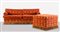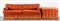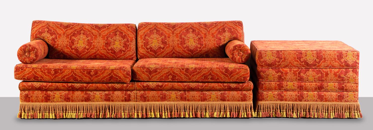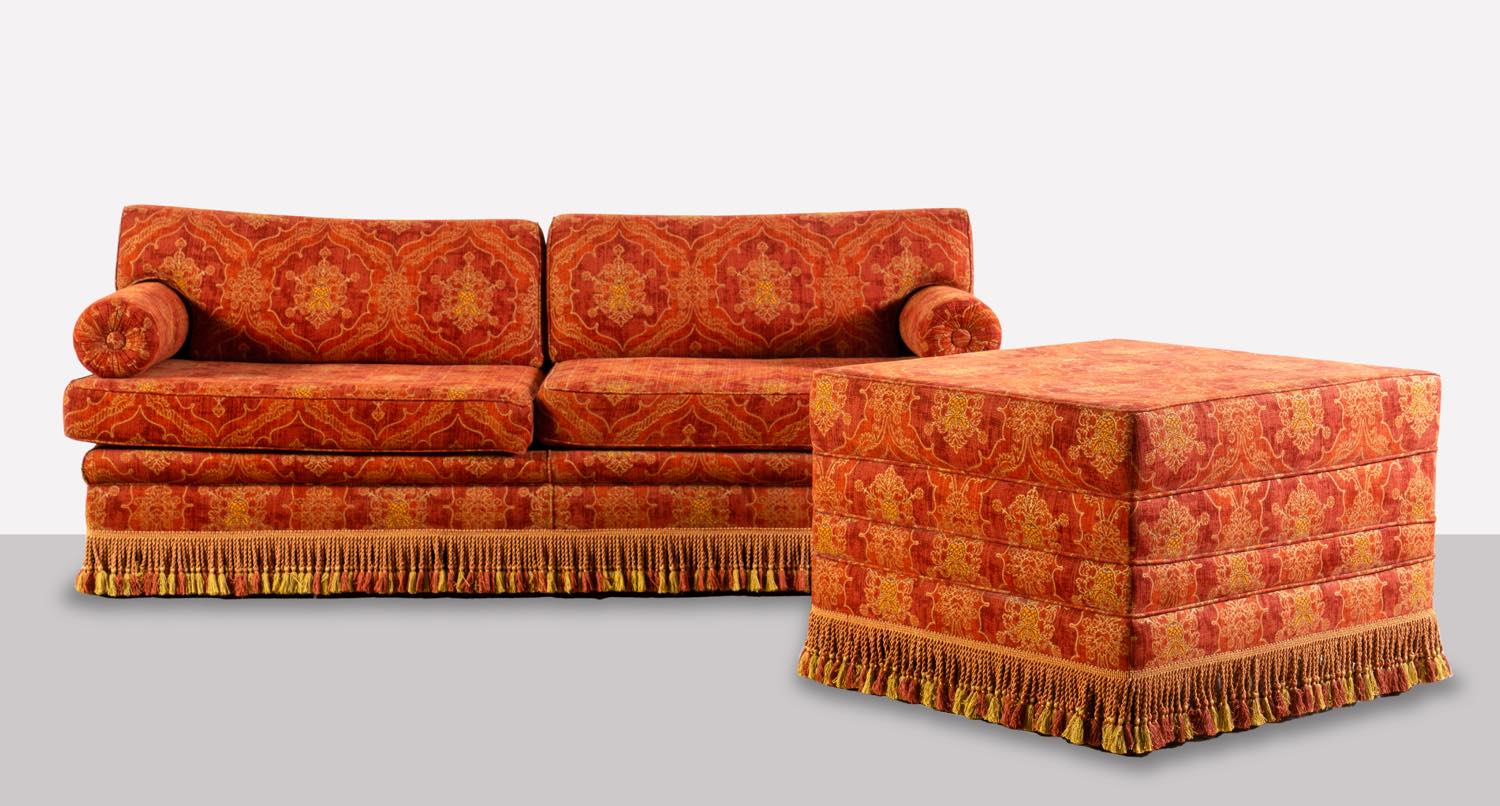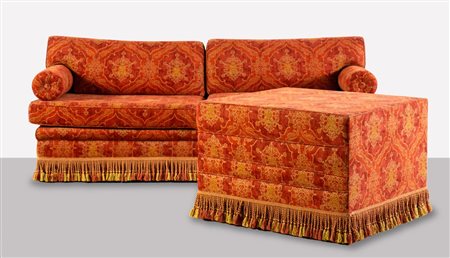 Strutture in legno imbottito e rivestito in tessuto damascato rosso con frange alla base, divano H cm 83x215x92 – H seduta cm 48; H tavolino cm 61x89x81 (usure – lievi difetti)