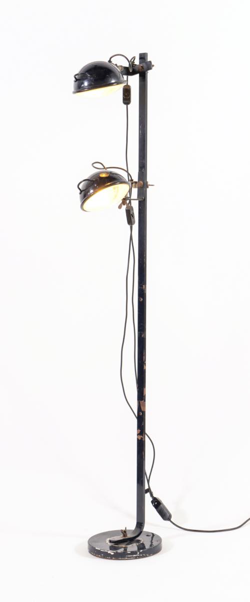 Struttura in metallo verniciato nero, presenta due riflettori regolabili in vetro stampato, reca sul vetro sigla della manifattura, H cm 163 – diametro base cm 25 (usure – lievi difetti)