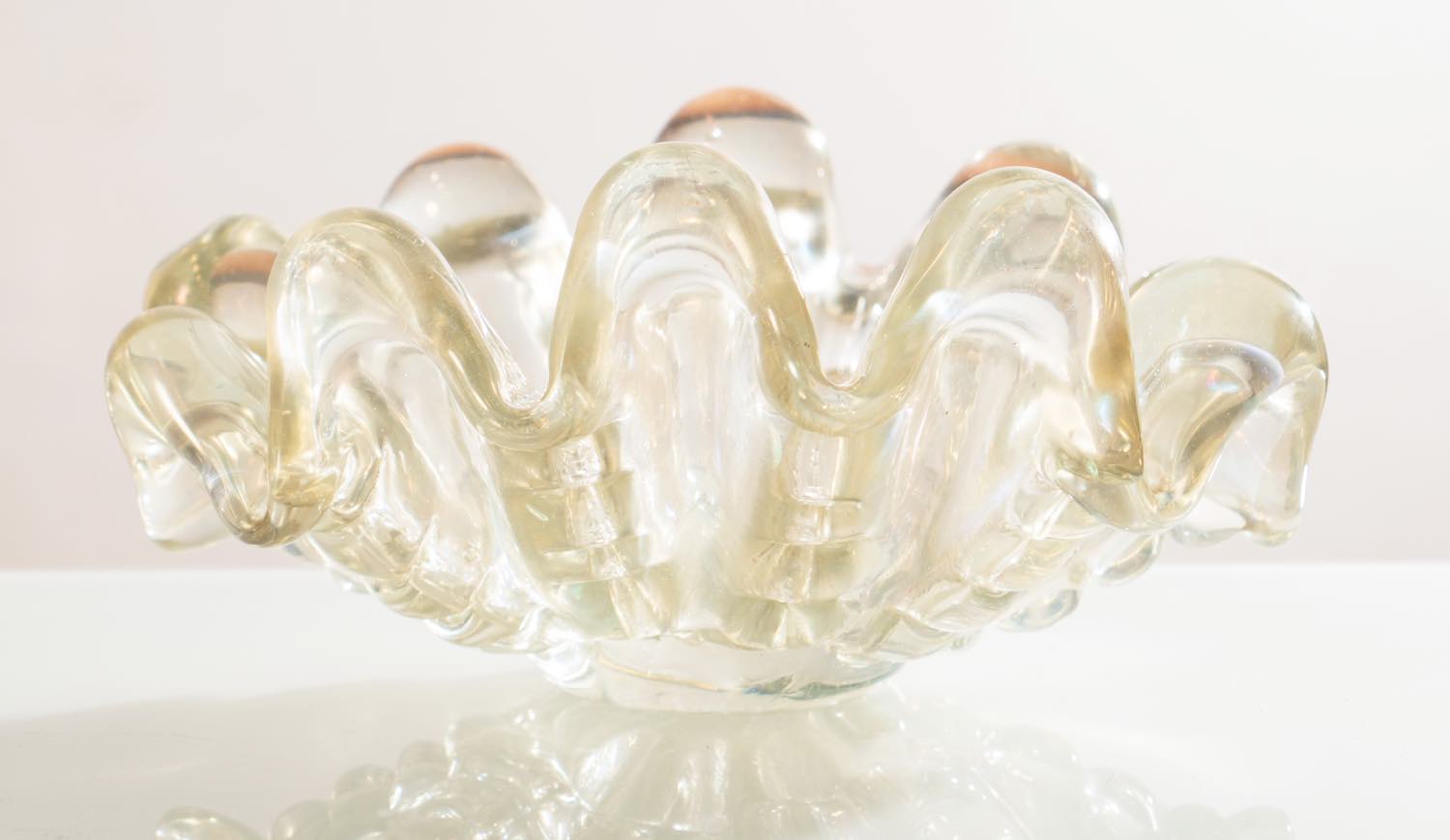 Ercole Barovier per Barovier & Toso, Grande coppa in vetro trasparente massiccio a forma di conchiglia, Murano, Anni ‘40.