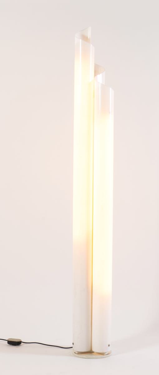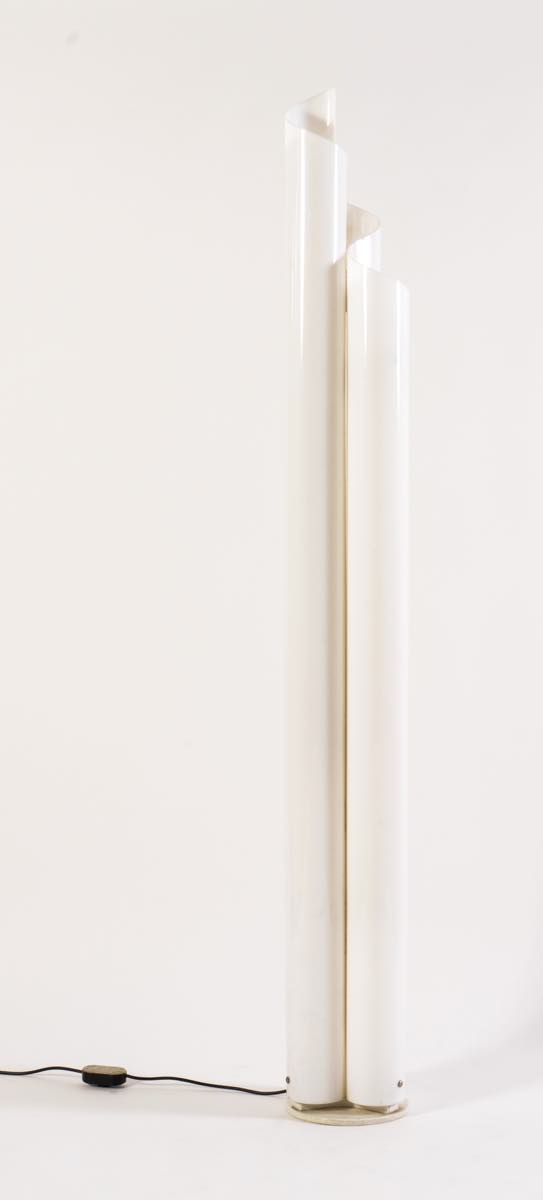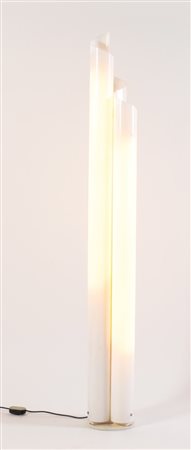 Lampada da terra in metacrilato opalino, base circolare in metallo laccato, reca sotto la base marchio della manifattura, titolo e designer, H cm 182 – diametro max cm 23 (usure – difetti)