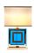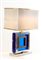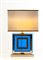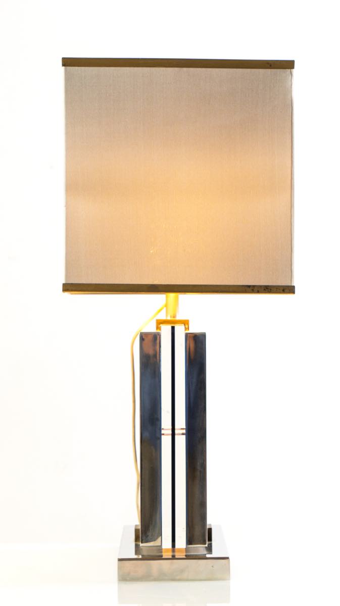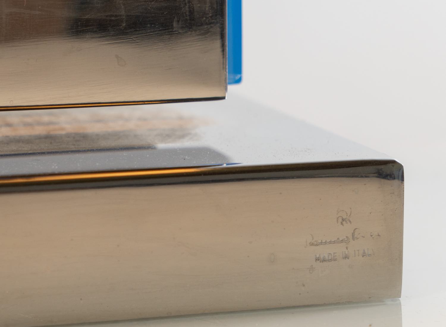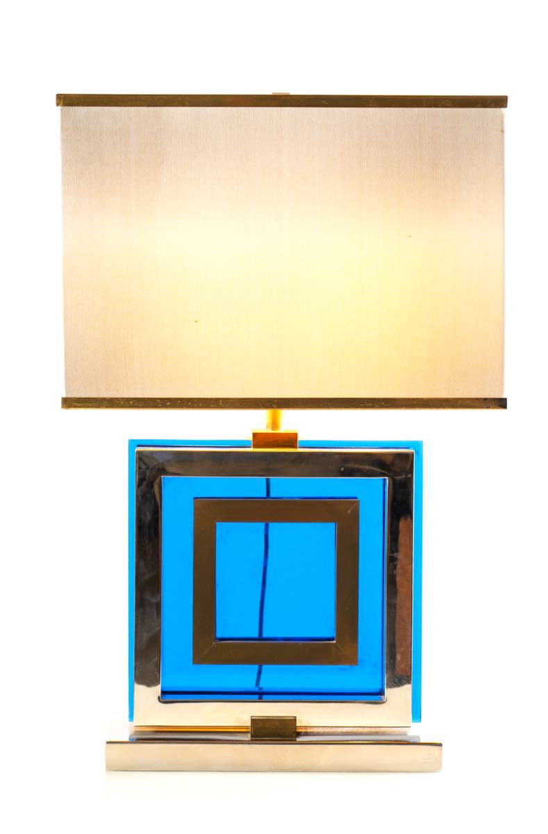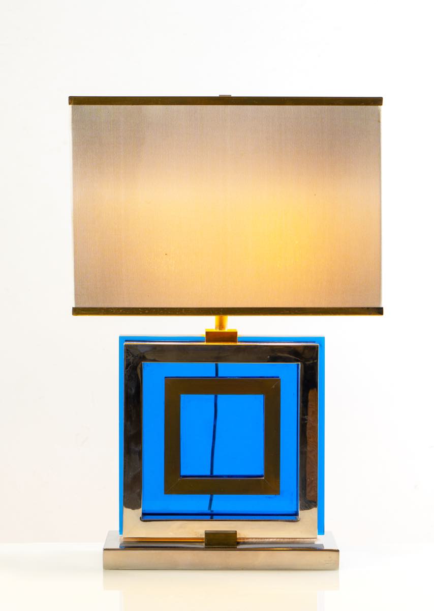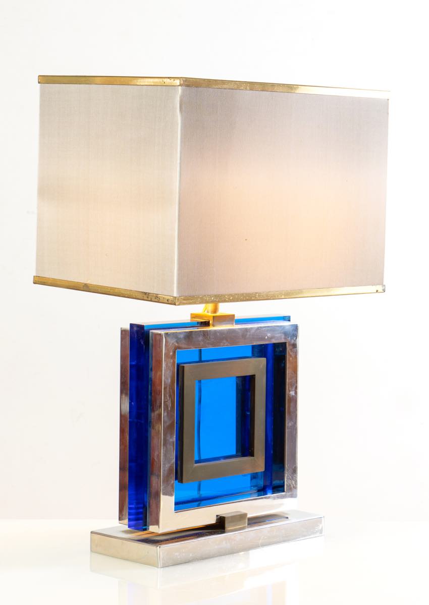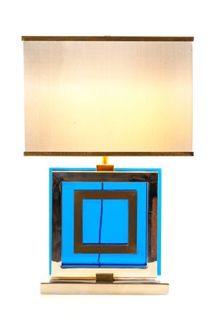 Corpo centrale in perpex blu e acciaio cromato, dettagli in ottone dorato, paralume originale in tessuto con finiture in ottone dorato, reca alla base firma del designer e iscrizione “made in Italy”, H tot cm 72x46x32.5 (lievi usure – ossidazioni all’ottone)