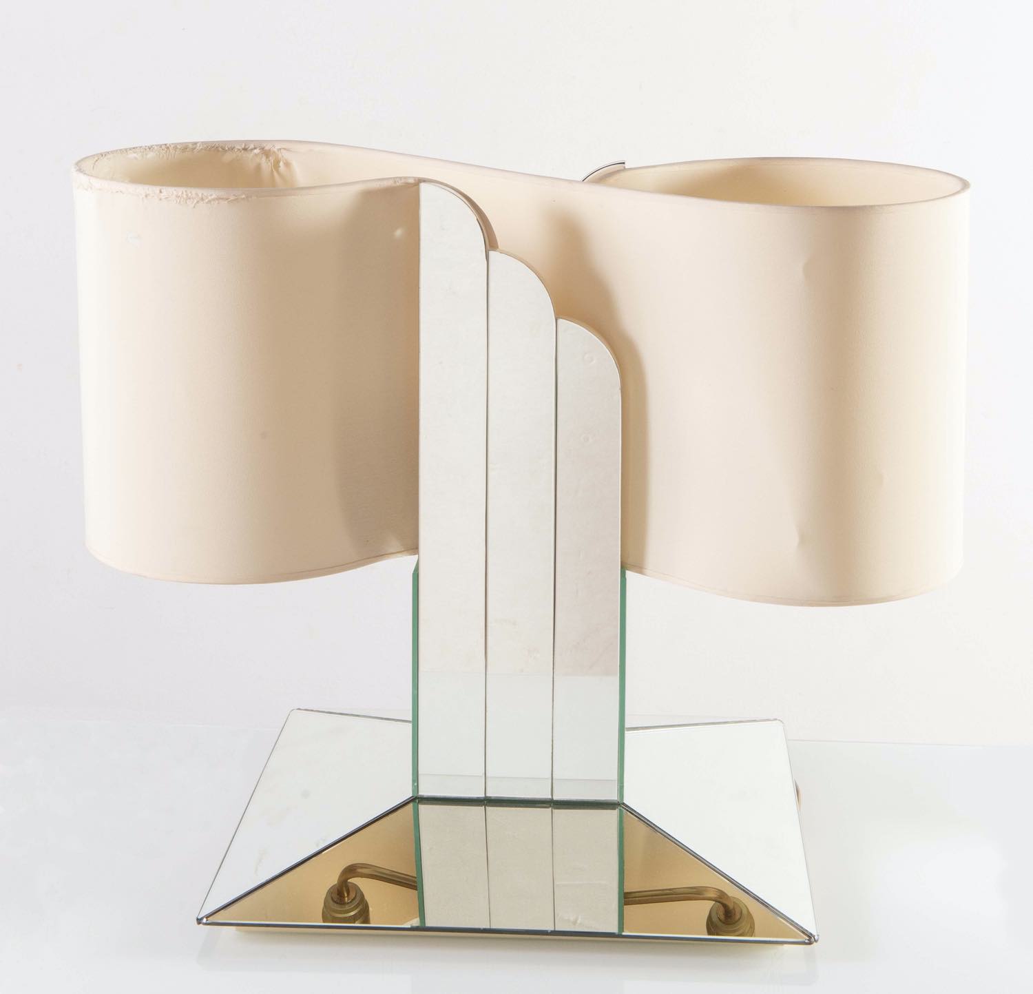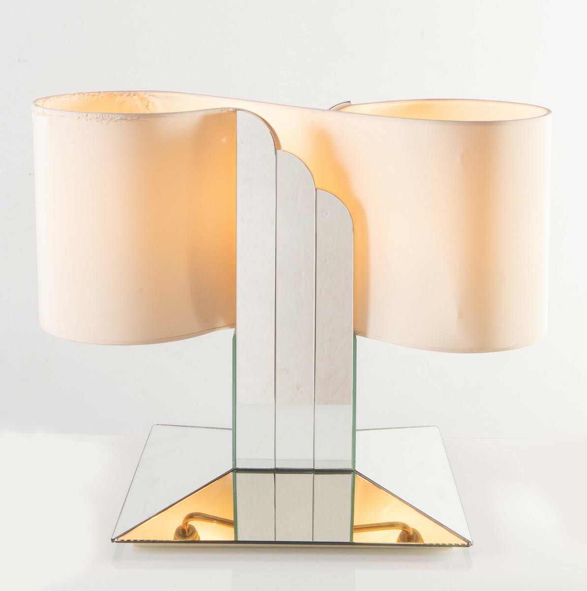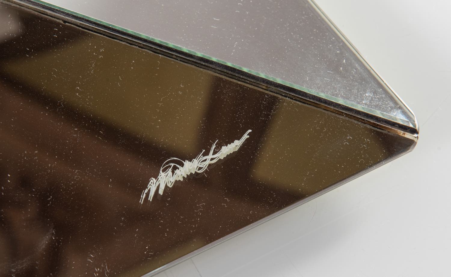 Base e struttura rivestiti con elementi specchiati molati, completa di cappello originale in tessuto, reca firma alla base, H cm 59x65.5x42 (usure – difetti al cappello)