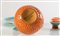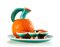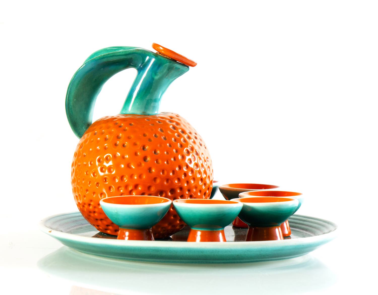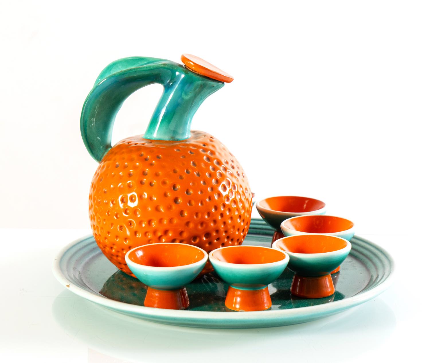 Composto da: bottiglia a forma di arancia, sei bicchierini e vassoio dipinti in policromia arancione e verde, recano sotto la base marchio della manifattura, H bottiglia cm 17 – diametro del piatto cm 27.5 (lievi usure)