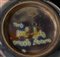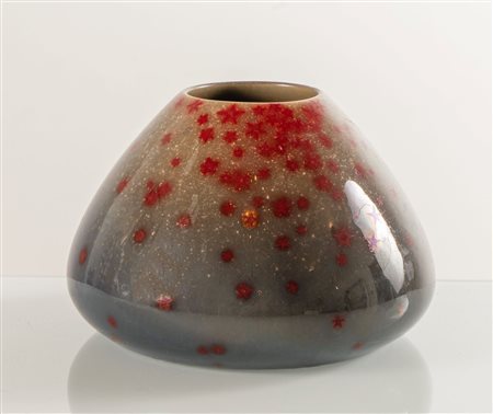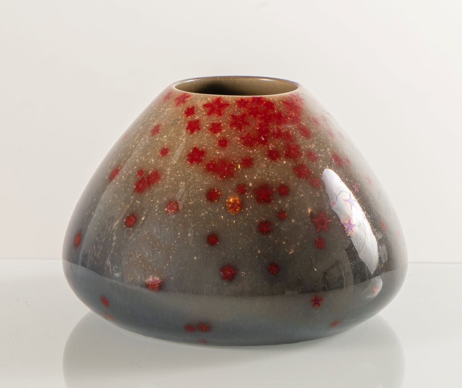 Corpo a sezione circolare degradante, superficie decorata con stelline rosse sparse su fondo grigio e finitura a lustro, reca alla base iscrizione “M C. M/Golfe Juan/A. M.” e marchio impresso della manifattura, H cm 9.5 – diametro max cm 14