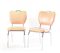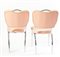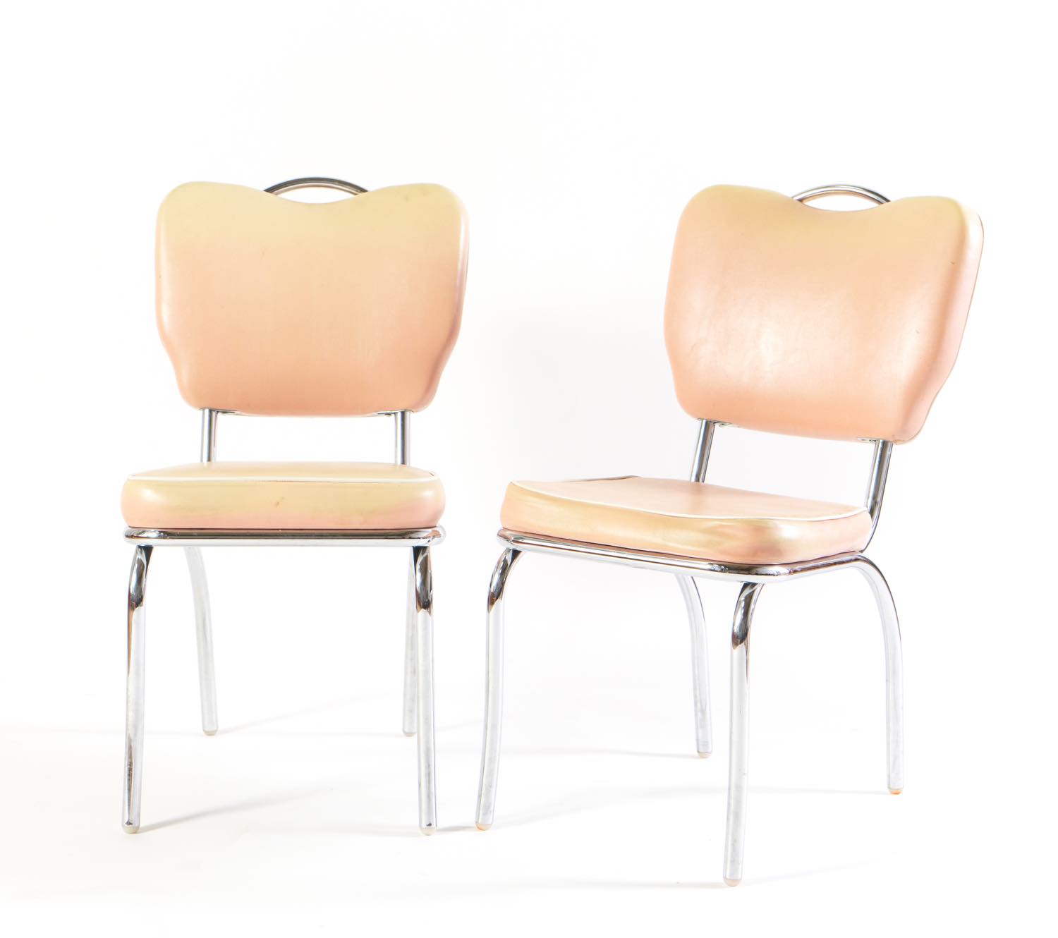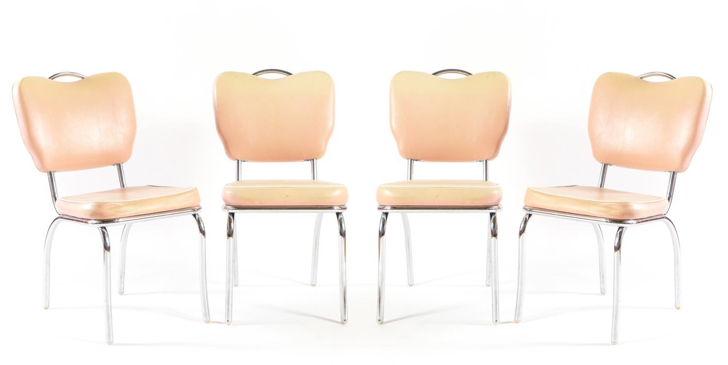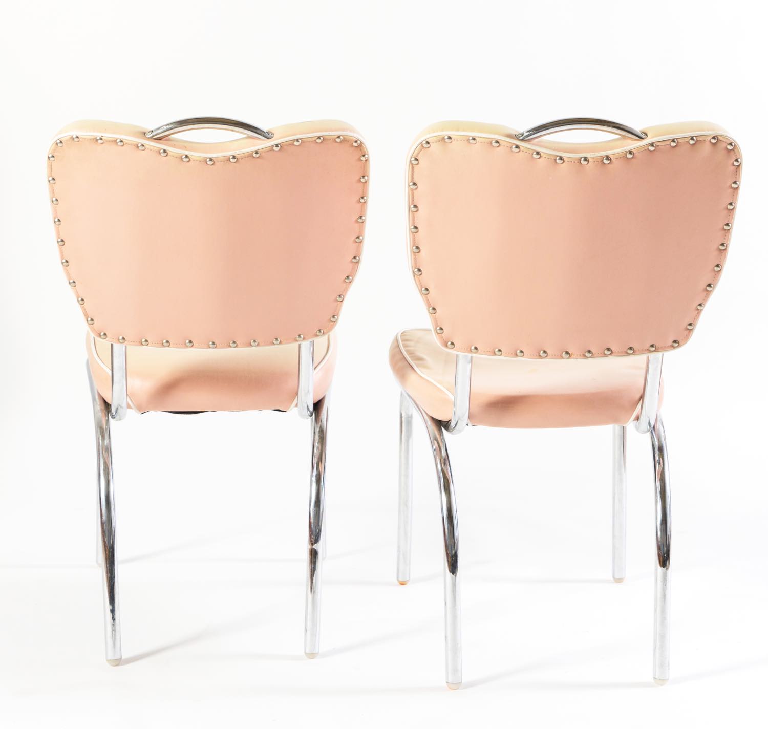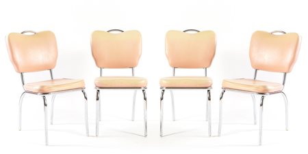 Struttura in tubolare cromato, seduta e schienale imbottiti rivestiti in skay colorato, presentano borchie stondate sul retro dello schienale, recano sotto la seduta etichetta della manifattura, H cm 88x50x55 – H seduta cm 48 (usure)