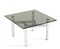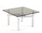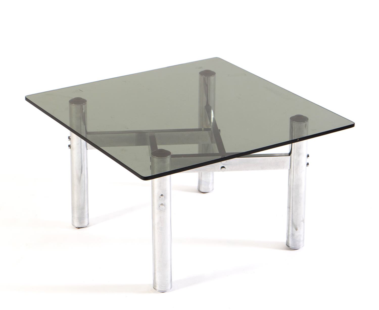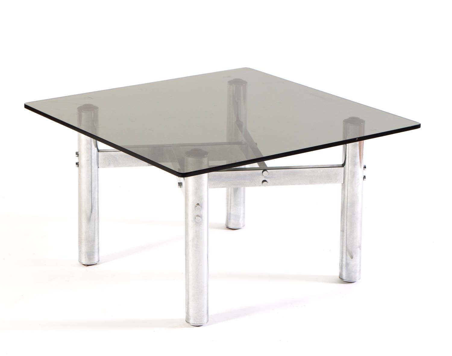 Base composta da quattro gambe unite al centro da raccordo geometrico, piano quadrato in vetro fumé, H cm 39x65x65