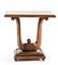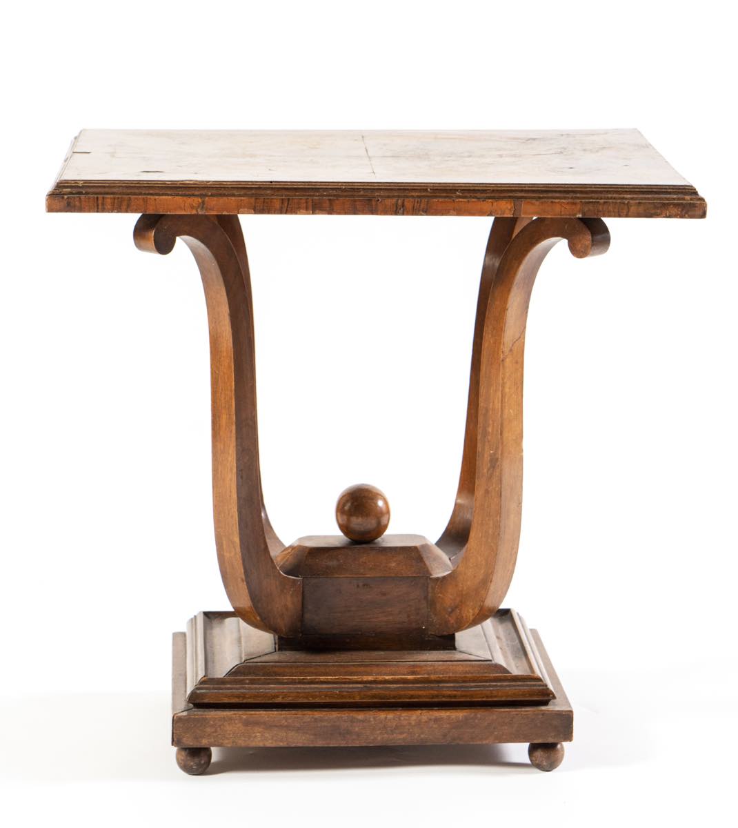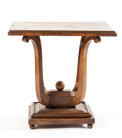 Piano rettangolare rivestito in radica poggiante su quattro gambe a lira con decorazione sferica centrale, H cm 58x60x40 (usure – lievi difetti)