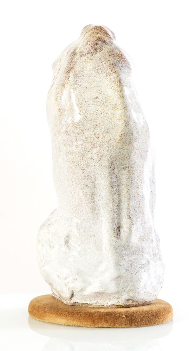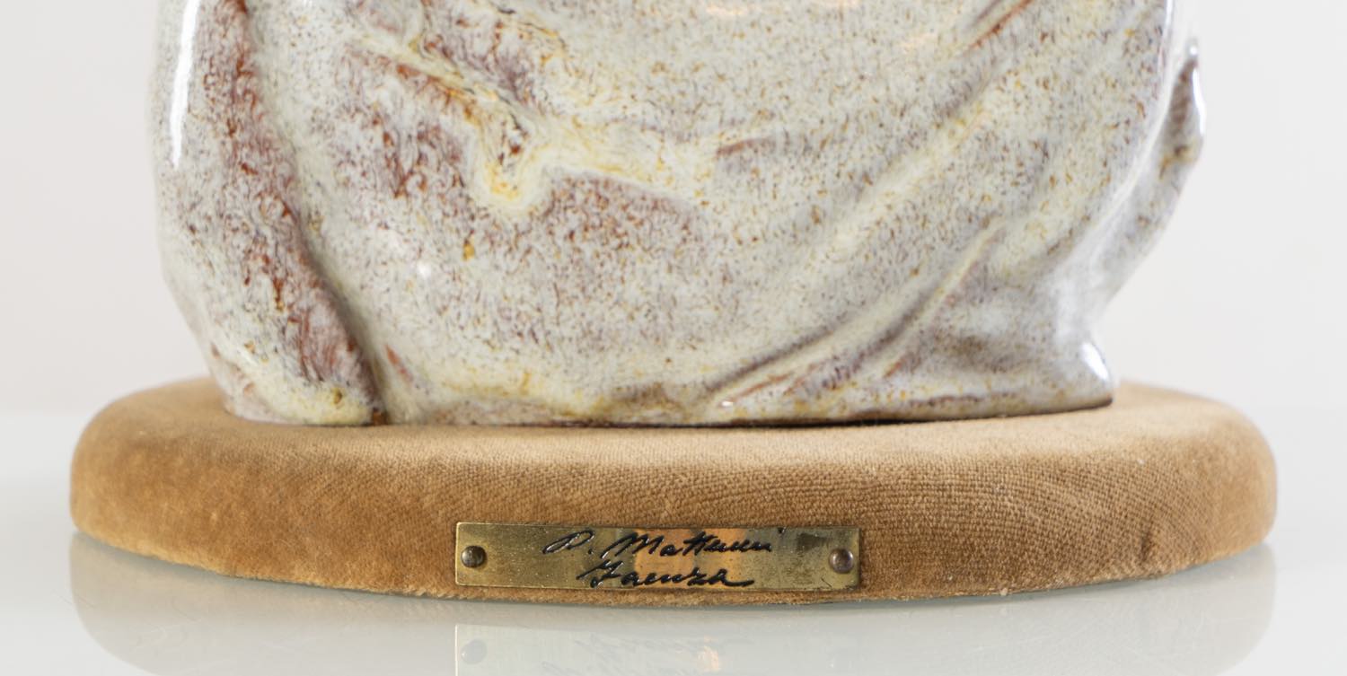 Scultura in terracotta maiolicata a stampo, montata su base rivestita in velluto, reca alla base etichetta “D. Matteucci/Faenza”, presenta sotto la base etichetta della manifattura, H tot cm 33x16.5x13