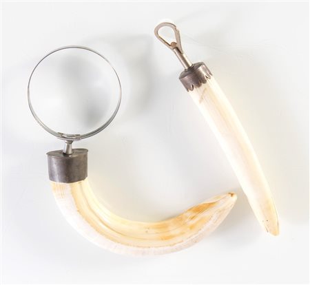 Lotto di due oggetti da scrivania in dente di facocero con finiture in metallo, XX secolo.