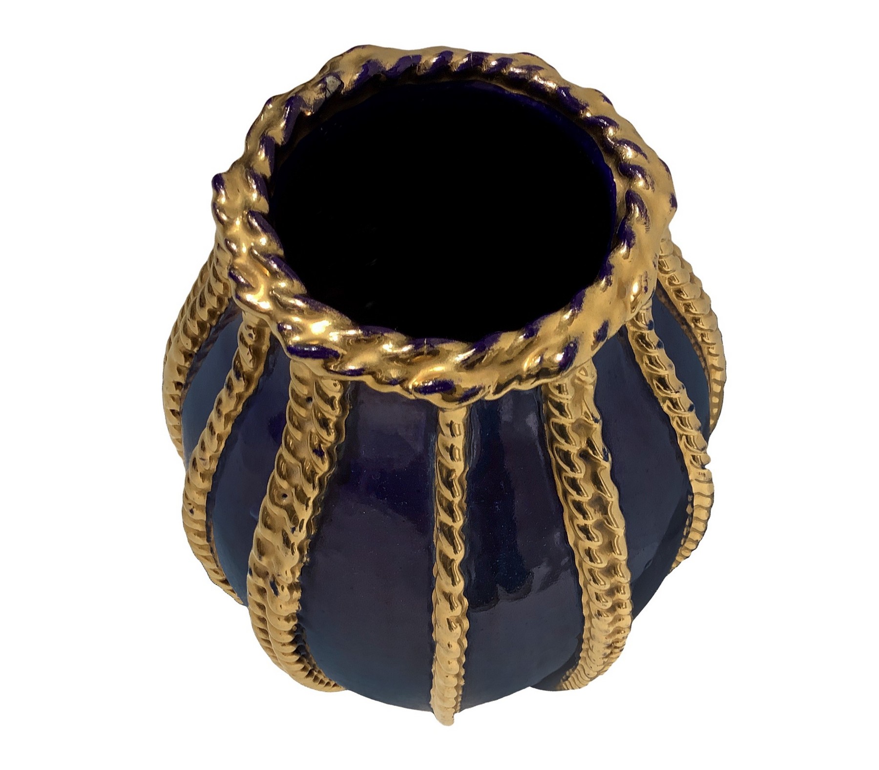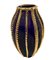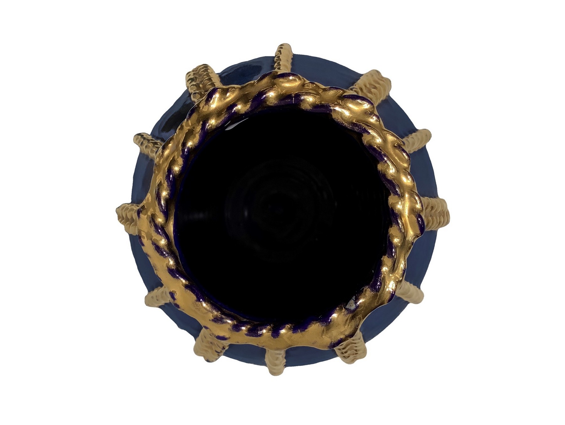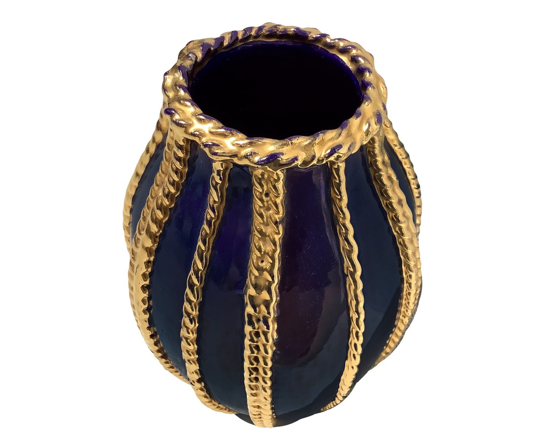 Vaso con fondo blu cordonato oro, 40s H 34 cm x 9 cm (bocca) terraglia modellata colaggio Forma globulare.