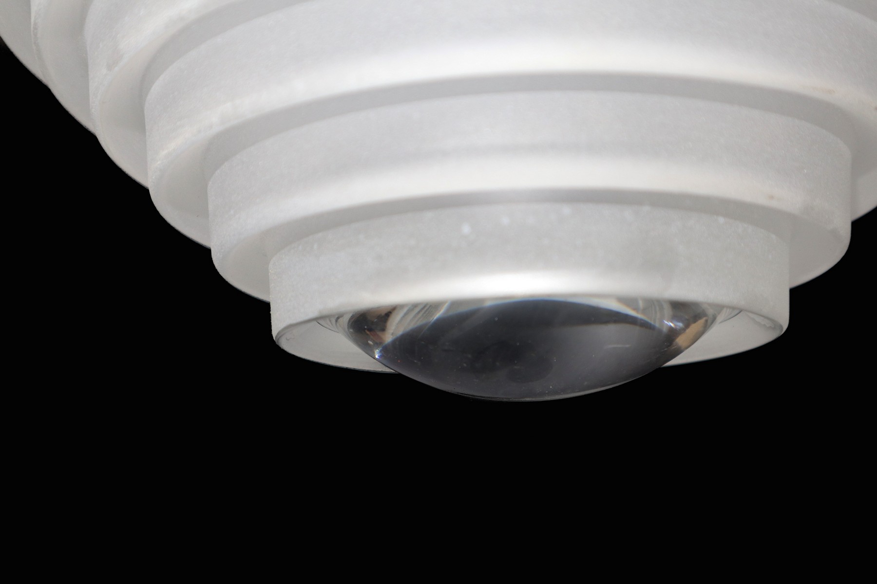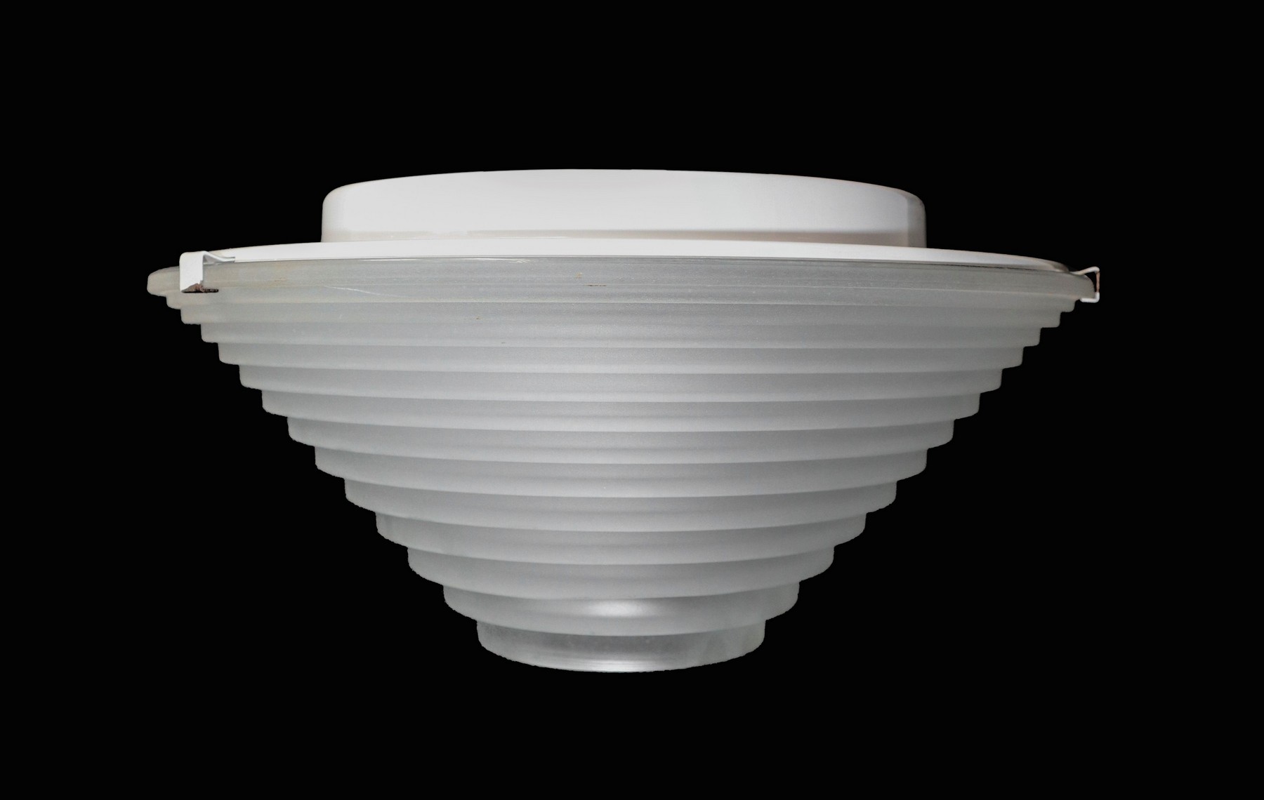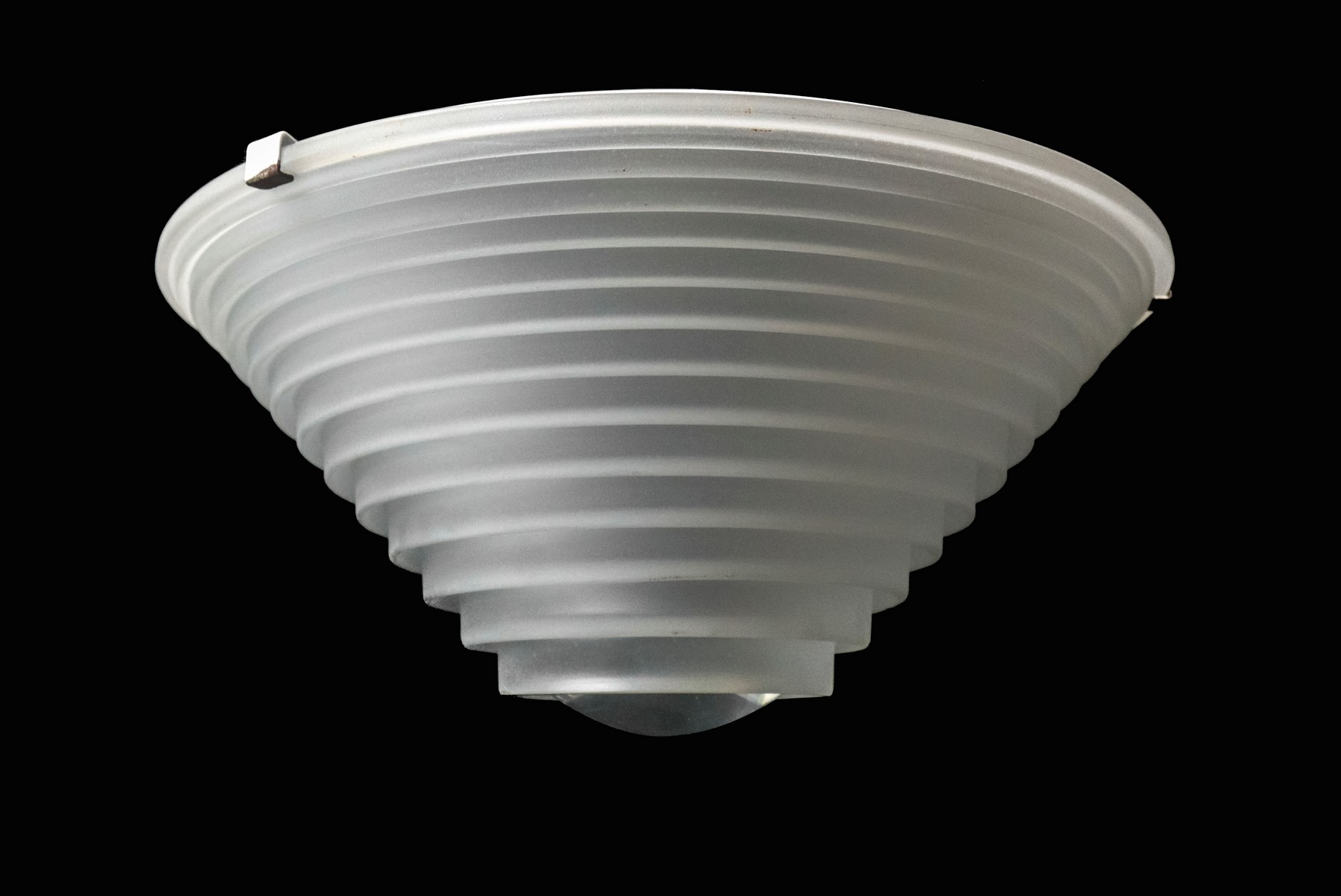 Artemide - Lampada a plafone, disegno Angelo Mangiarotti , Mod. Egisto Struttura in metallo e vetro satinato di forma conica con diffusore a lente. Etichetta della manifattura, segni d'uso.