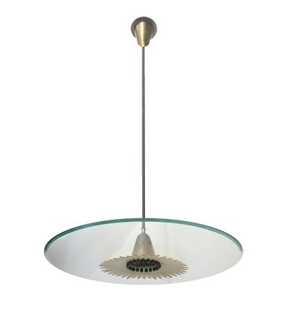 Luigi Brusotti (attribuito a) - Lampada a sospensione, Attr. Brusotti Luigi. D 50 Diffusore di forma circolare con bordi molati e elementi in allumino laccato nei toni dell'avorio.