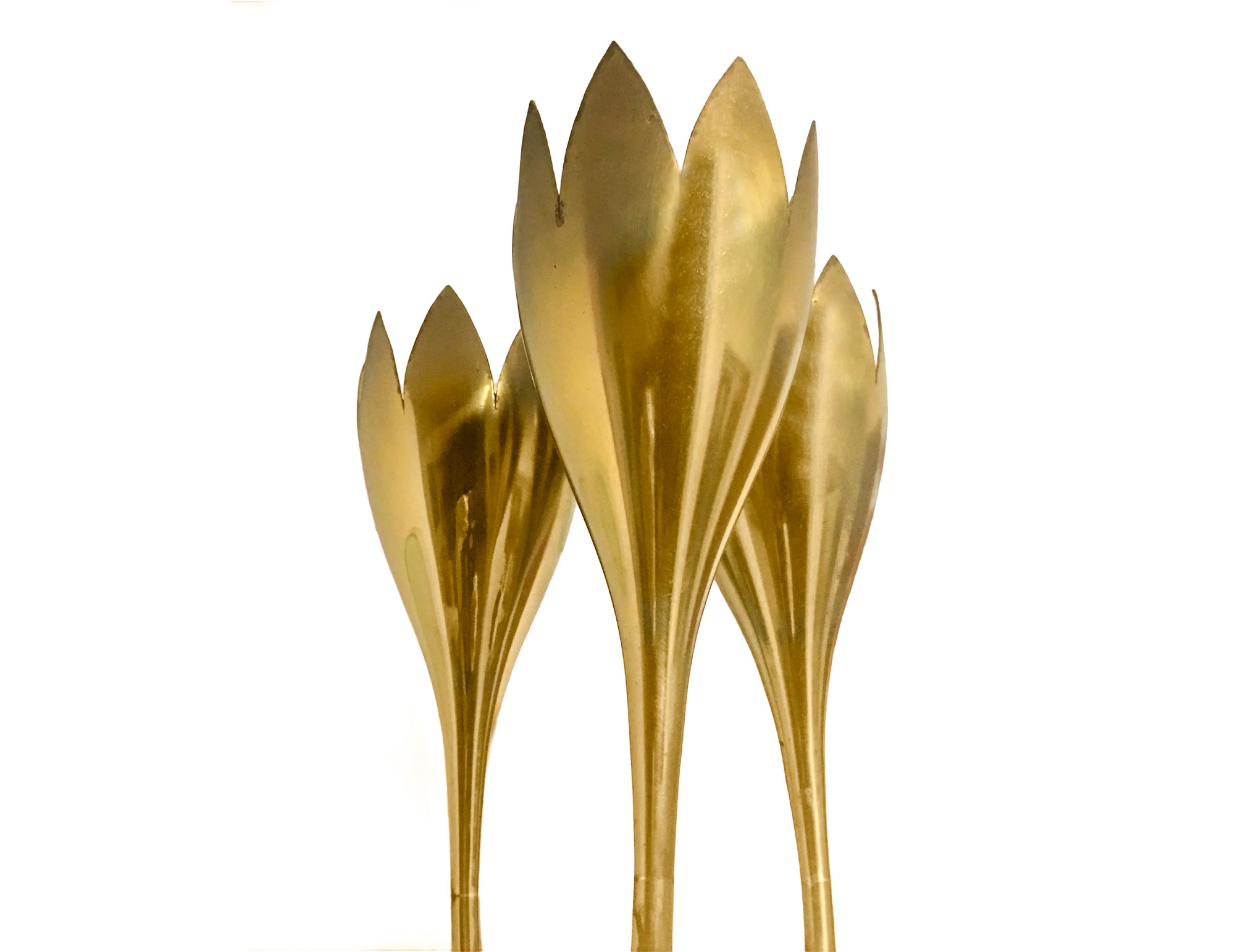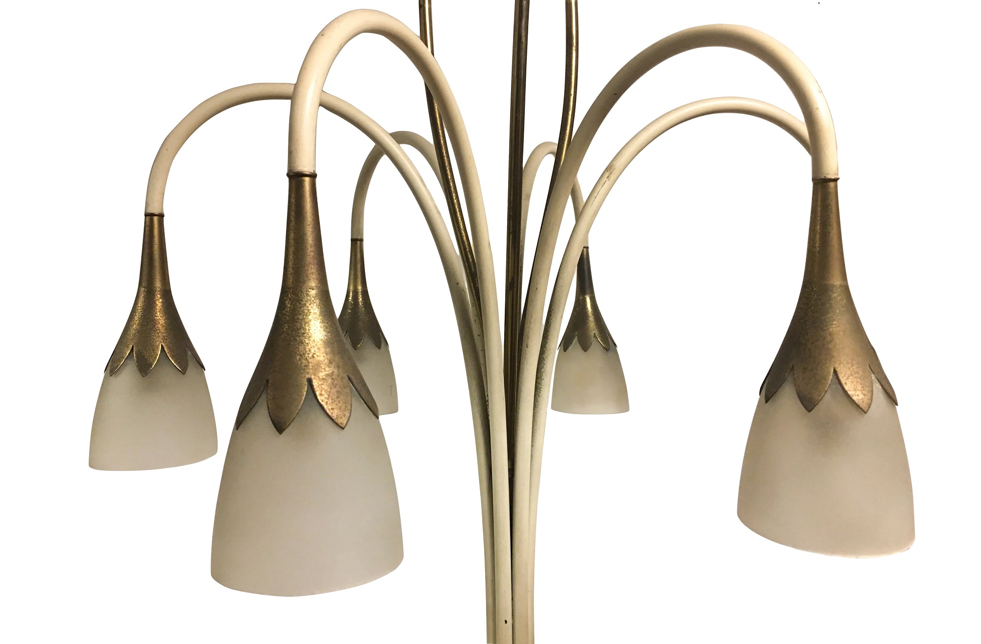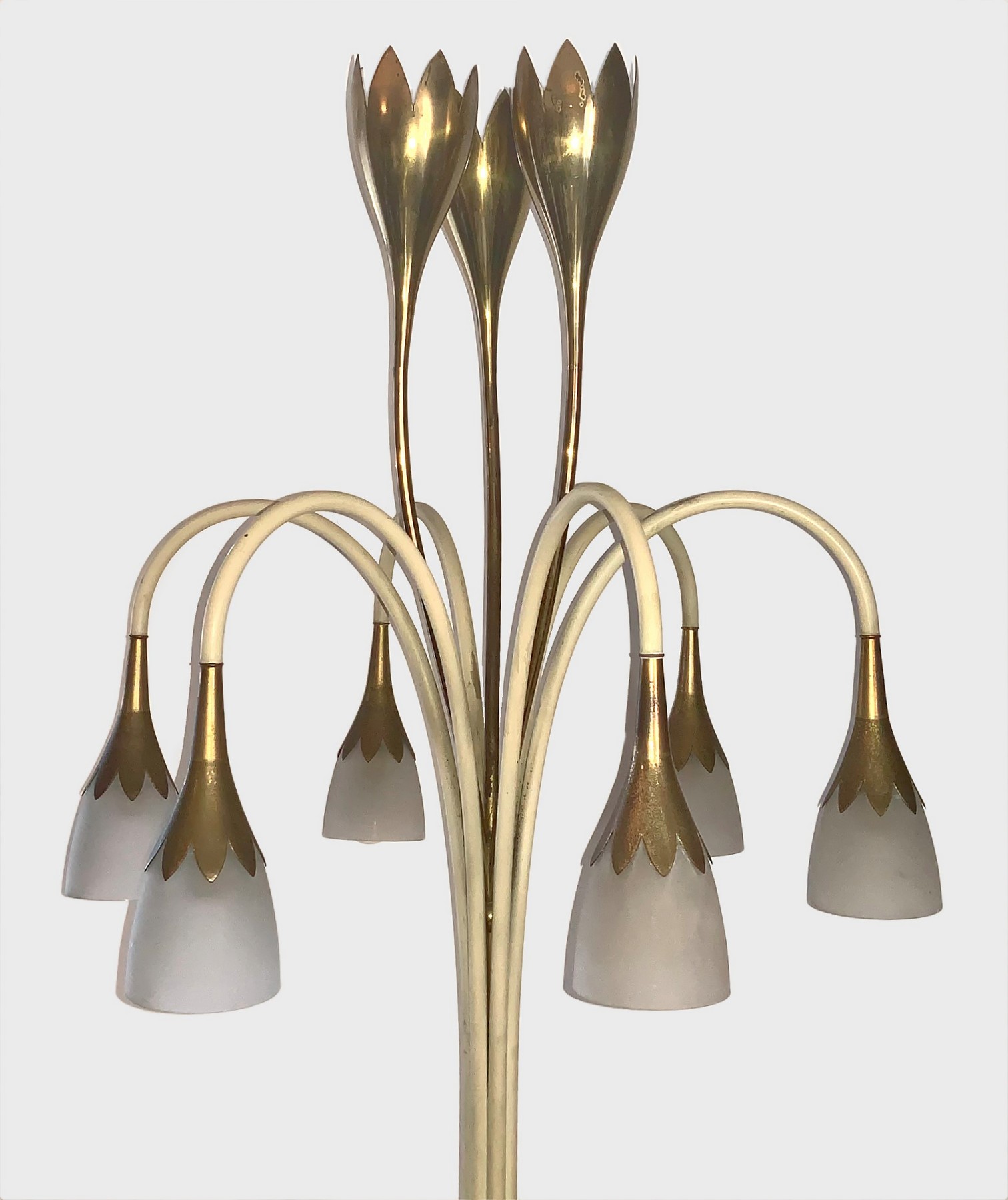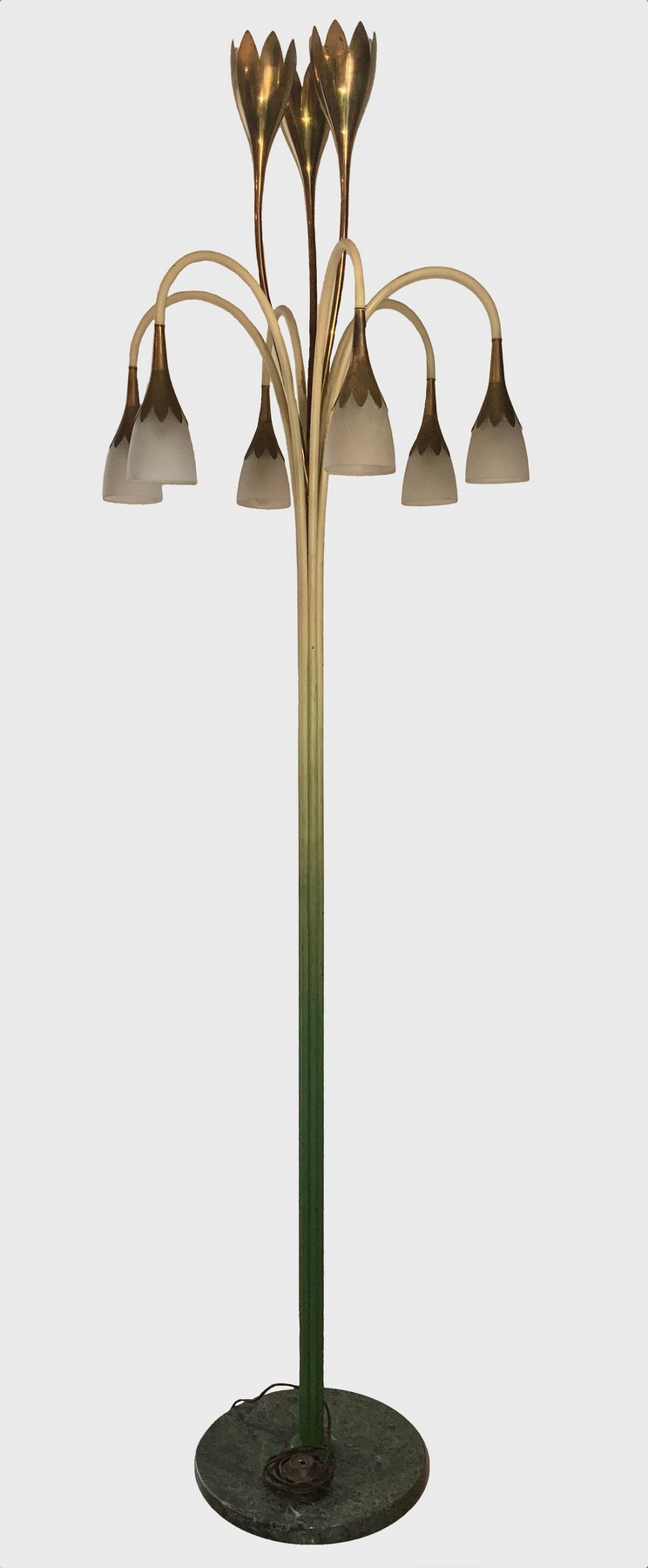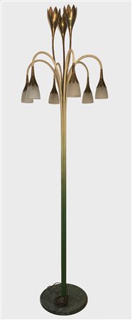 Angelo Lelii per Arredoluce - Piantana mod.Calla, 40s cm 210x50 Struttura in ottone laccato nei toni del verde e del bianco, diffusori in vetro sabbiato a guisa di campana. Luminator in ottone dorato e zapponato a guisa di calla. Base in marmo verde delle Alpi. Segni d'uso. Minime tracce di ossidazione. Da ri-elettrificare.