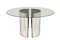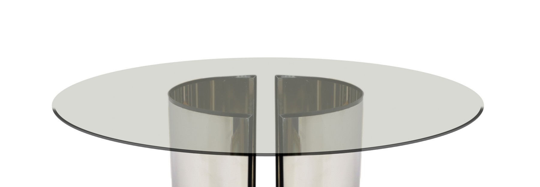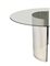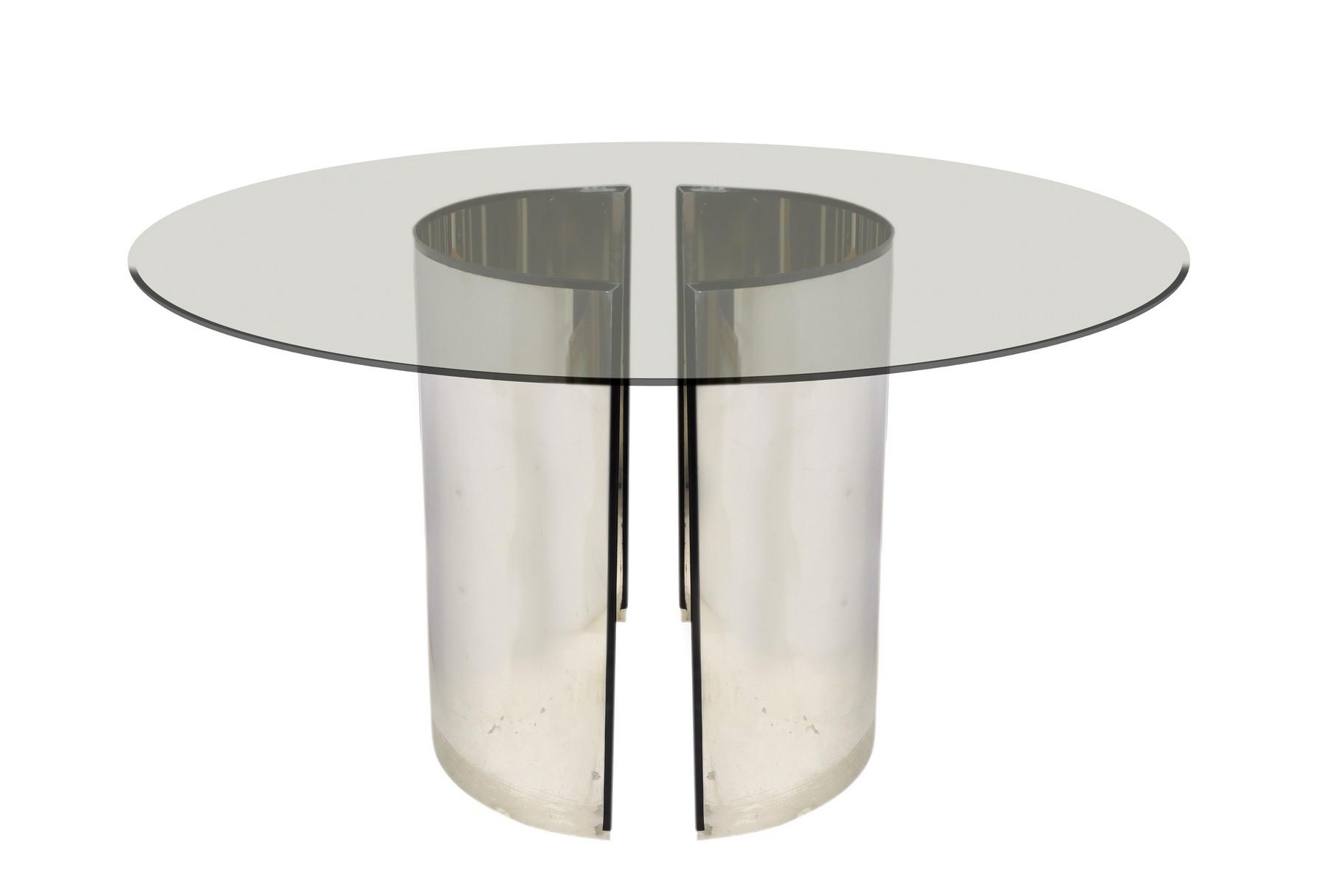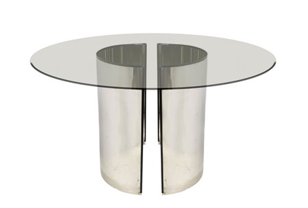 Tavolo, nello stile di Luigi Caccia Dominioni Tavolo da pranzo composto da due fogli in acciaio curvato liberamente collocabili, finitura lucida, piano di forma circolare in cristallo trasparente di forte spessore. Segni d'uso.
