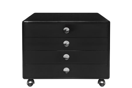 Eugenio Gerli per Tecno - Cassettiera a quattro cassetti, 60's h cm 52 x 65 x 50 Disegno Eugenio Gerli. Struttura in legno laccato nei toni del nero. Maniglie ad asola con dettagli in metallo cromato. Ruote alla base. Segni d'uso.