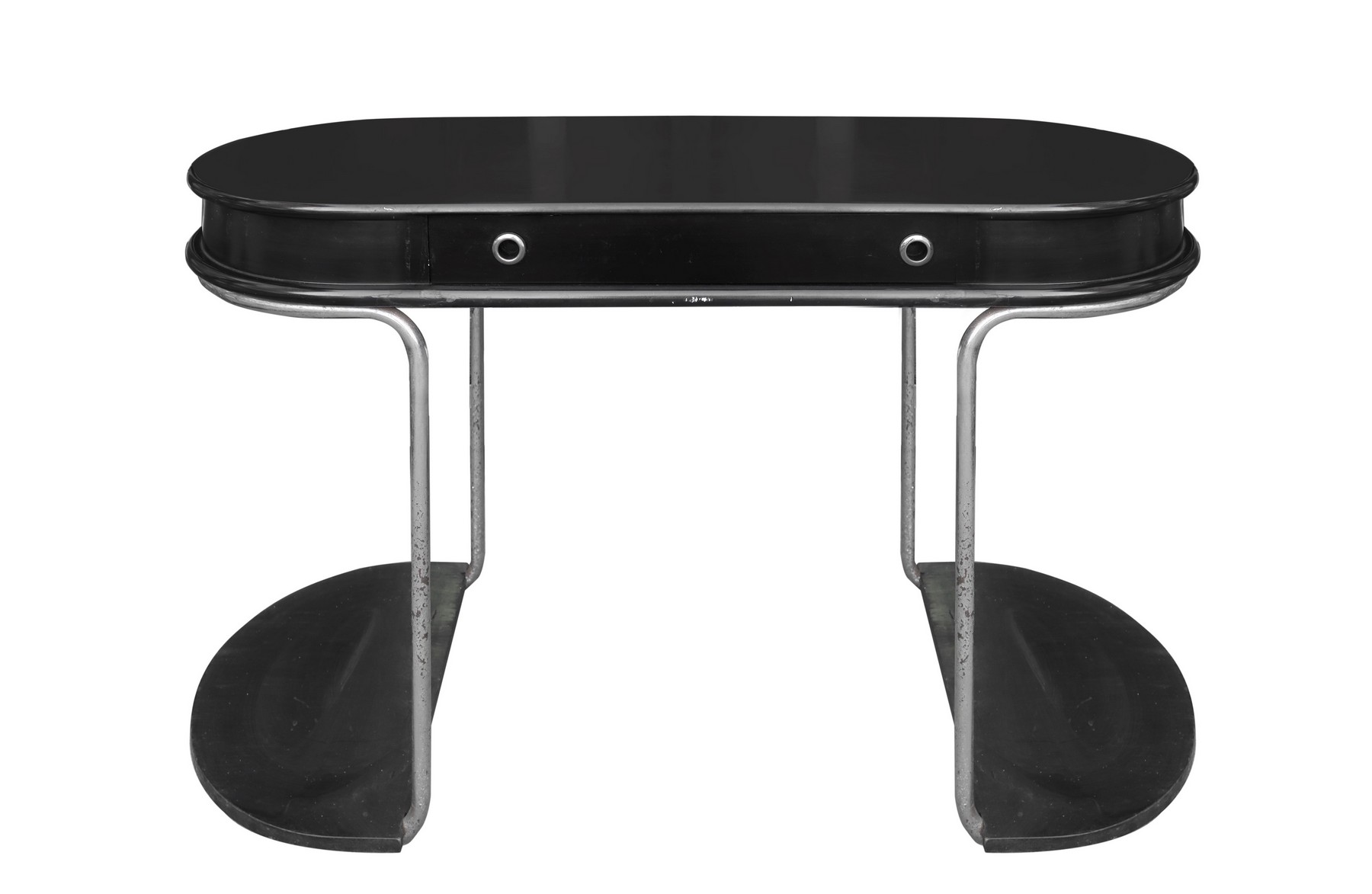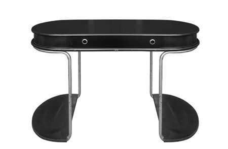 Console, prod. Italiana nello stile di Giotto Stoppino, 70's H cm 75x120, profondità cm 50 Piano in legno laccato di forma elittica, piedi in tubolare metallico cromato, tracce di ossidazioni, segni d'uso.